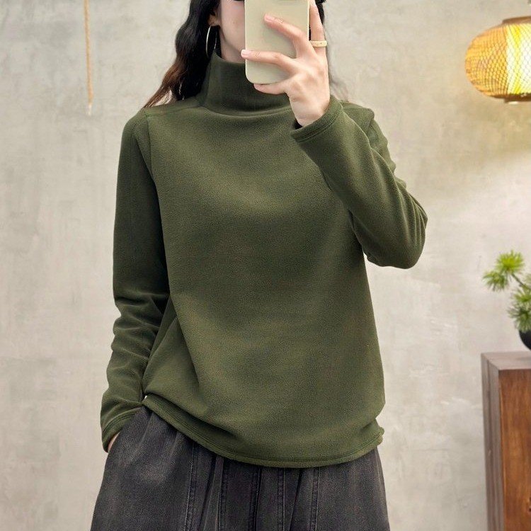 オリジナルの厚い2024冬の新しいファッションの透かし彫りの半高襟の純色の両面の絨毛の保温の底のシャツの上着の女性