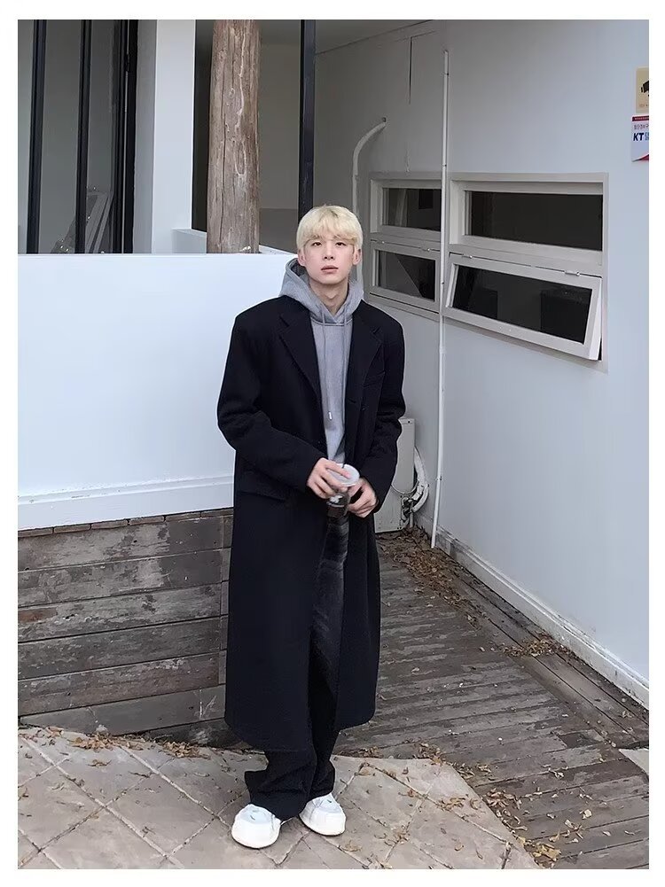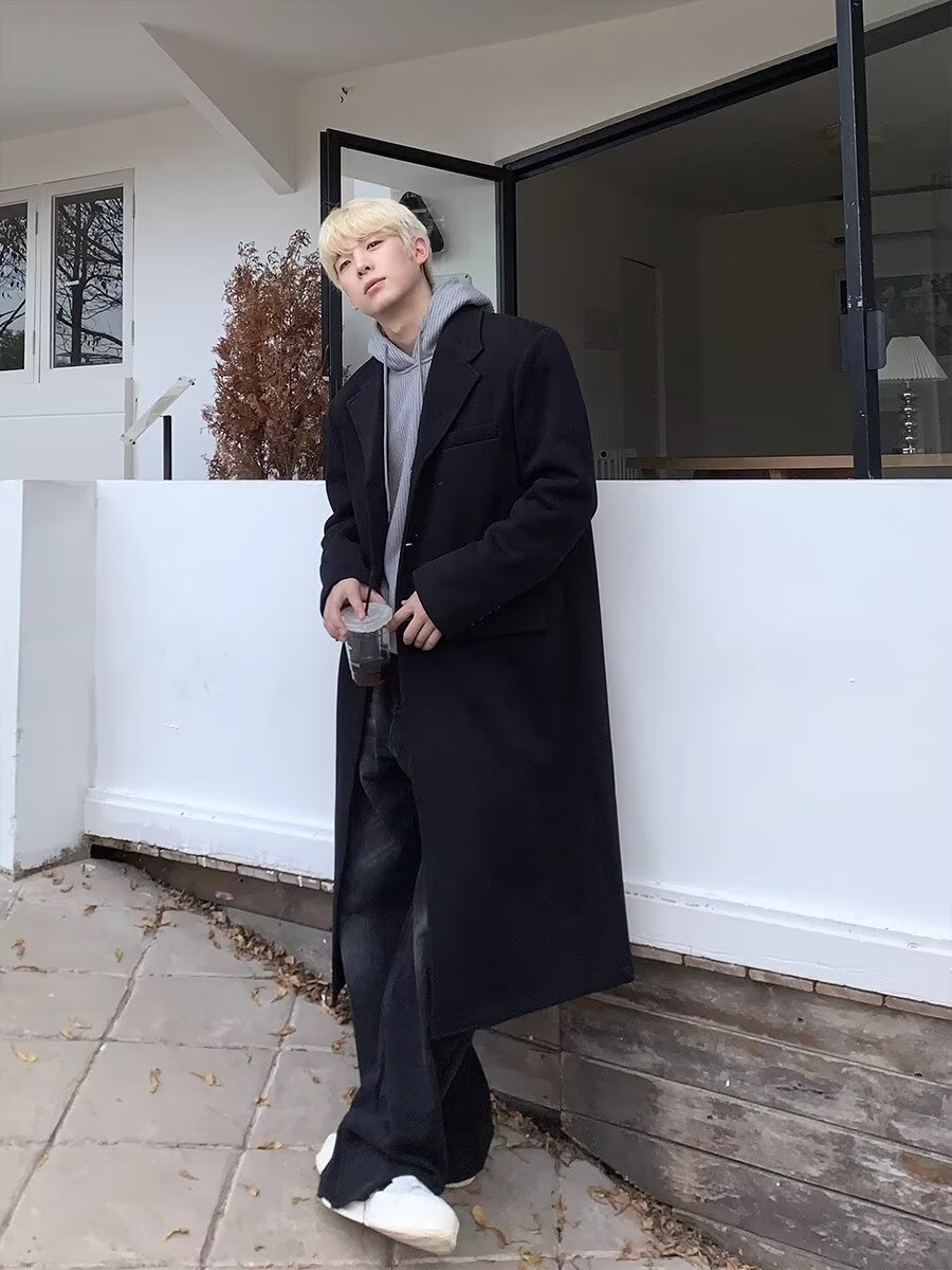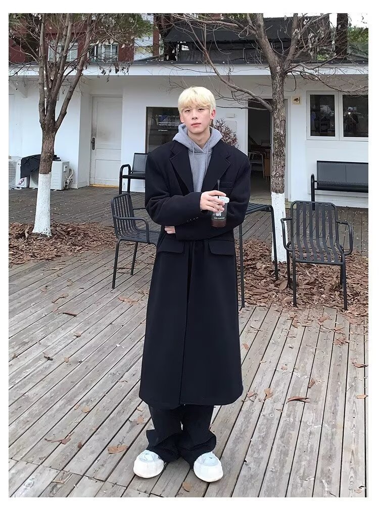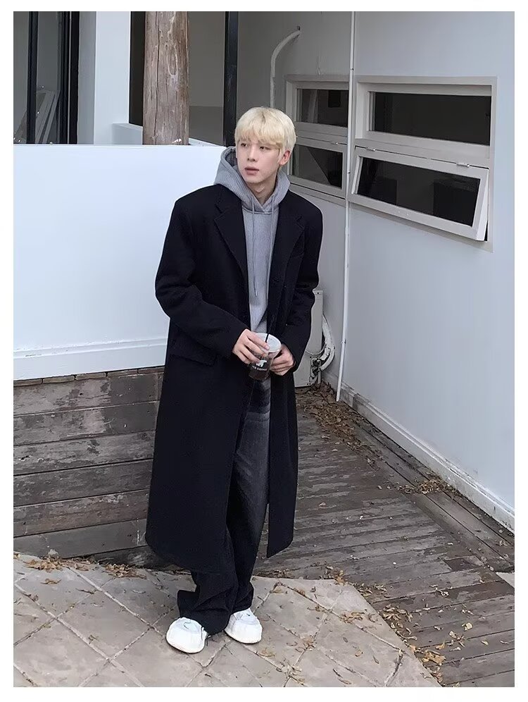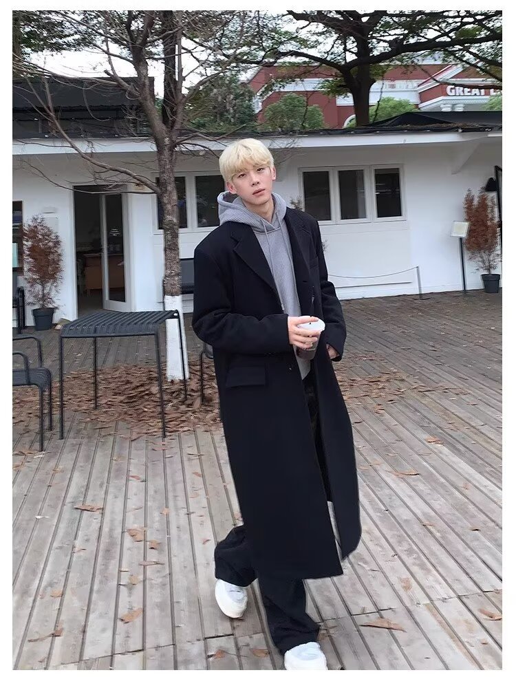 2024冬の黒いコート韓国版男性は膝を越えて長いスタイルのウインドブレーカーの若者のファッションがかっこいいコートがゆったりしています。