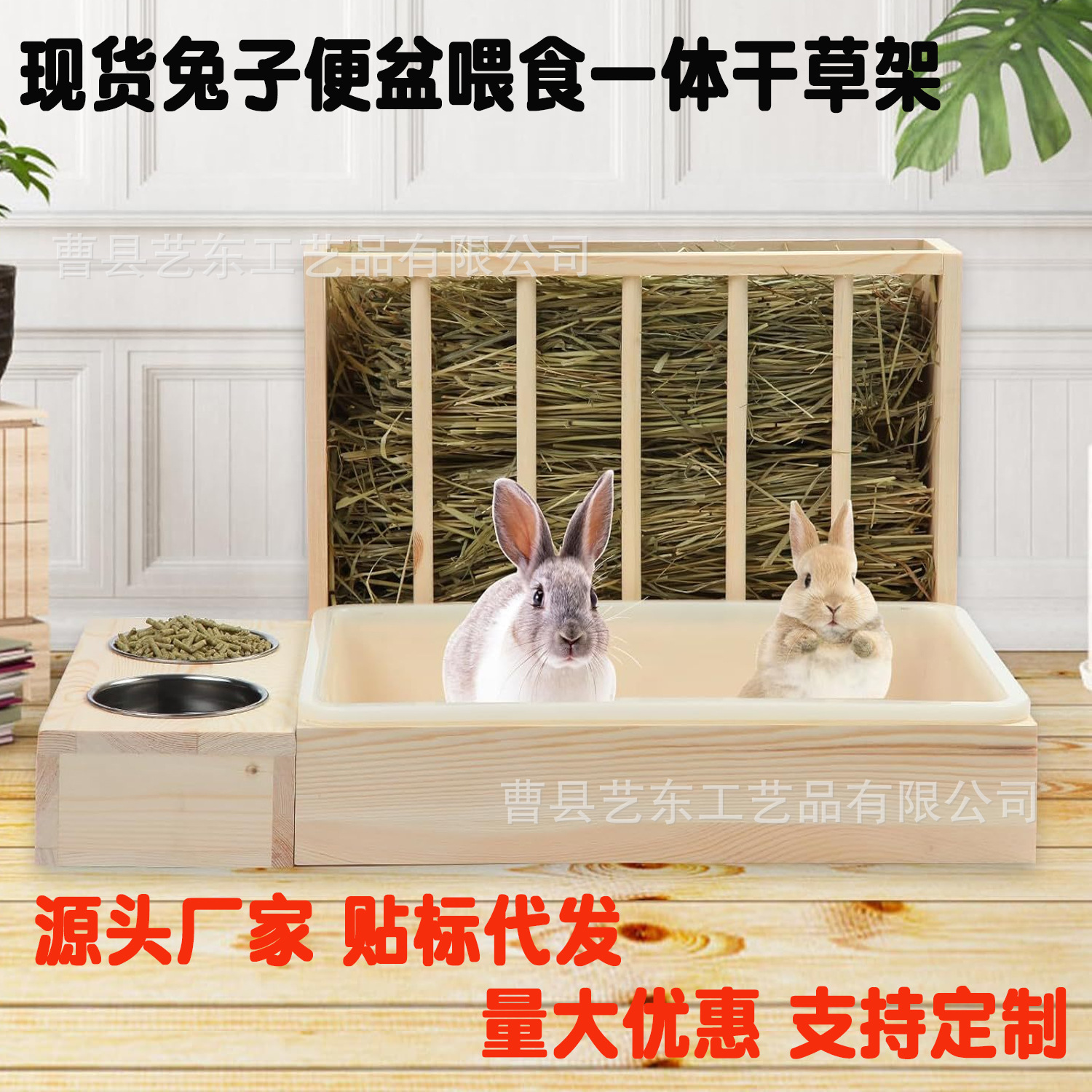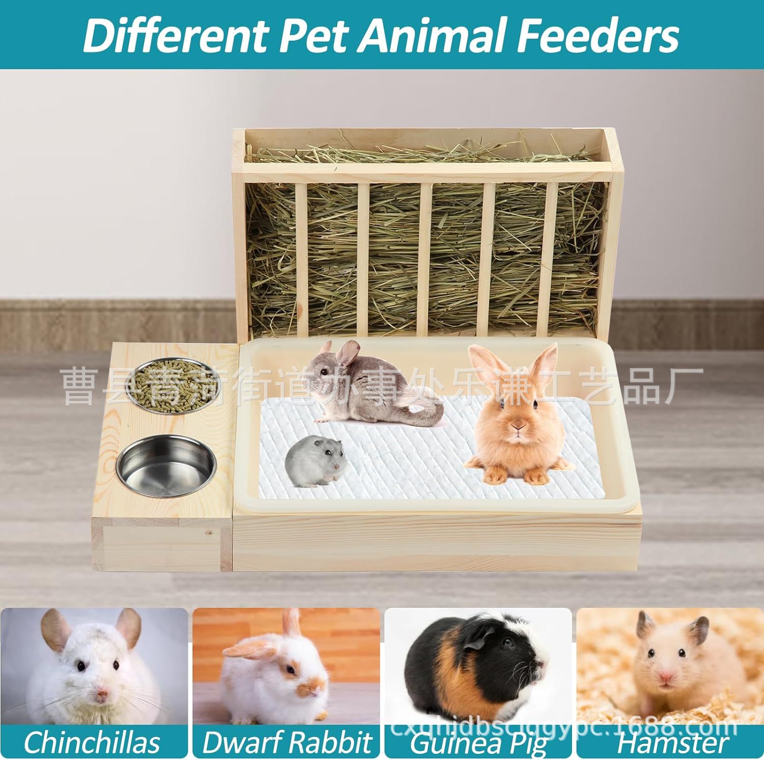 跨境3合1木质兔子喂食器猫砂豚鼠盆带干草喂食器碗小动物笼配件