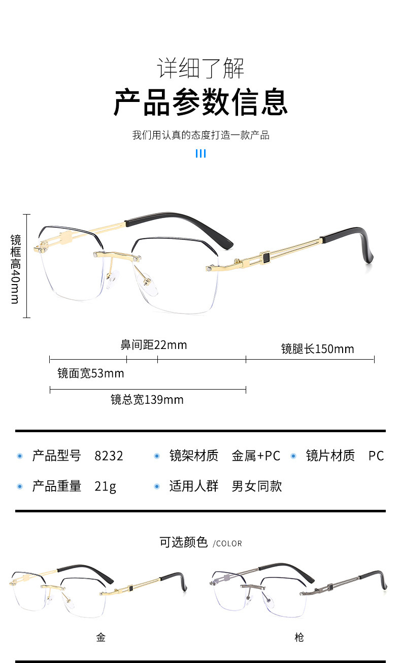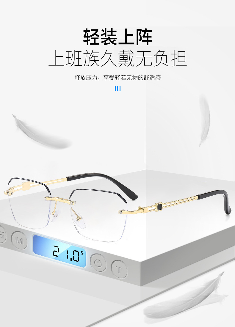ハイエンドファッション高颜値豪华金属フレームレスデザイン男女同モデル超軽量质感防ブルーライト老眼鏡