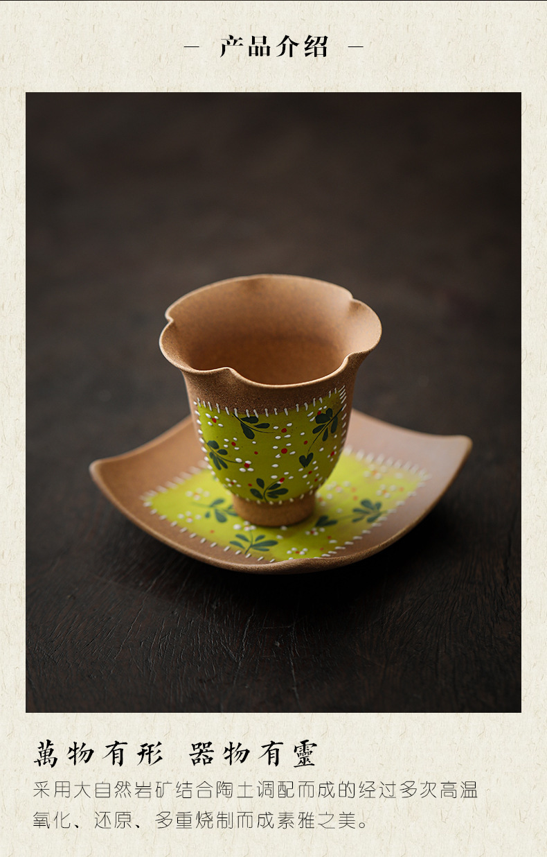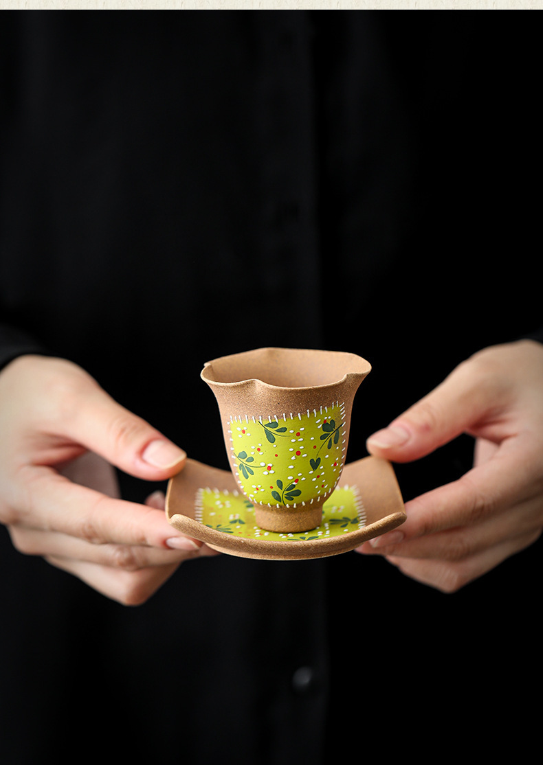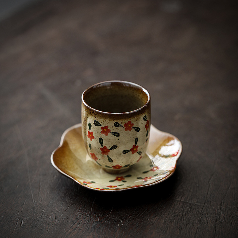 粗陶喝茶杯手绘女士主人杯带杯垫山茶花家用品茗单杯套杯陶瓷茶具