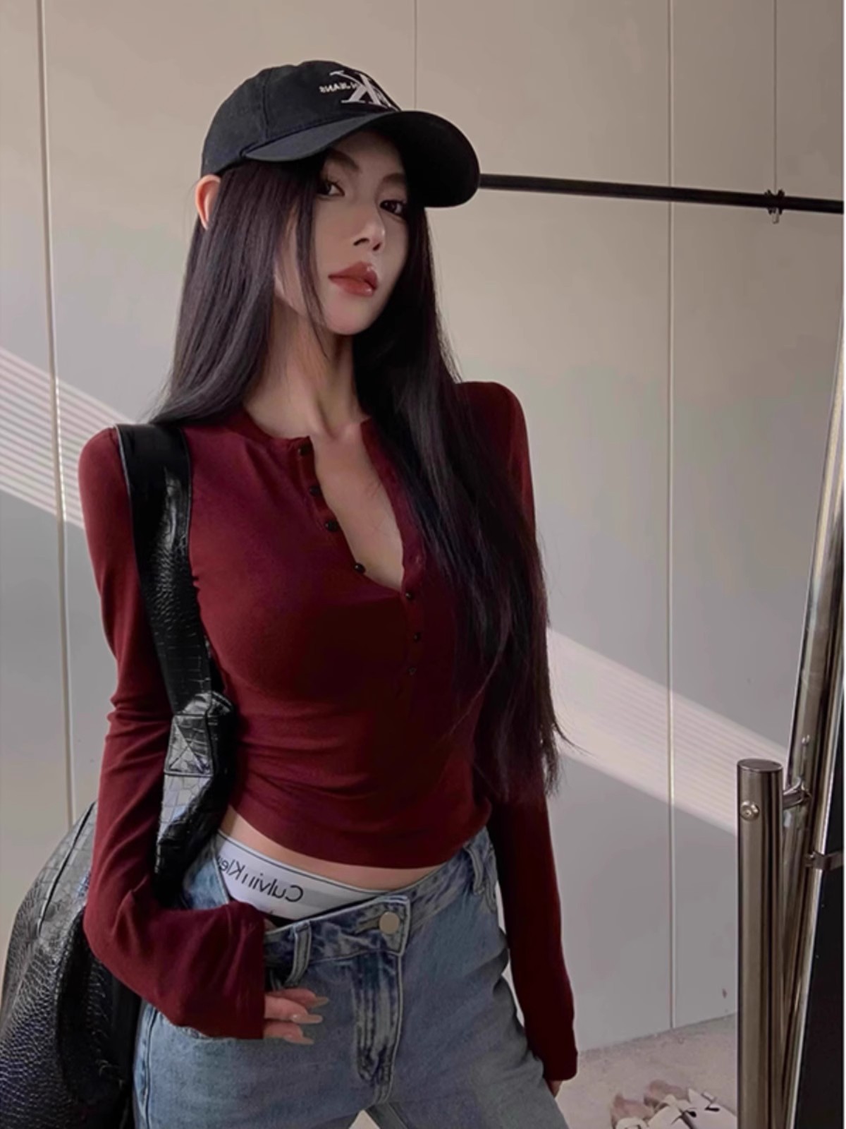 ギャルのワインレッドのvネックの長袖の中に底のシャツを掛けます。