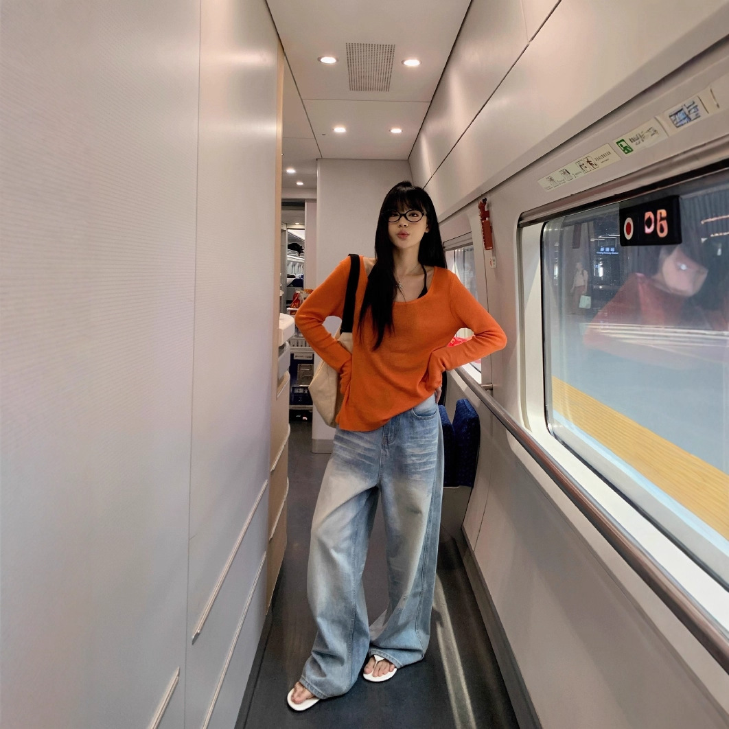 2025夏纯欲橘色薄款长袖防晒罩衫T恤女夏季辣妹宽松休闲露肩上衣