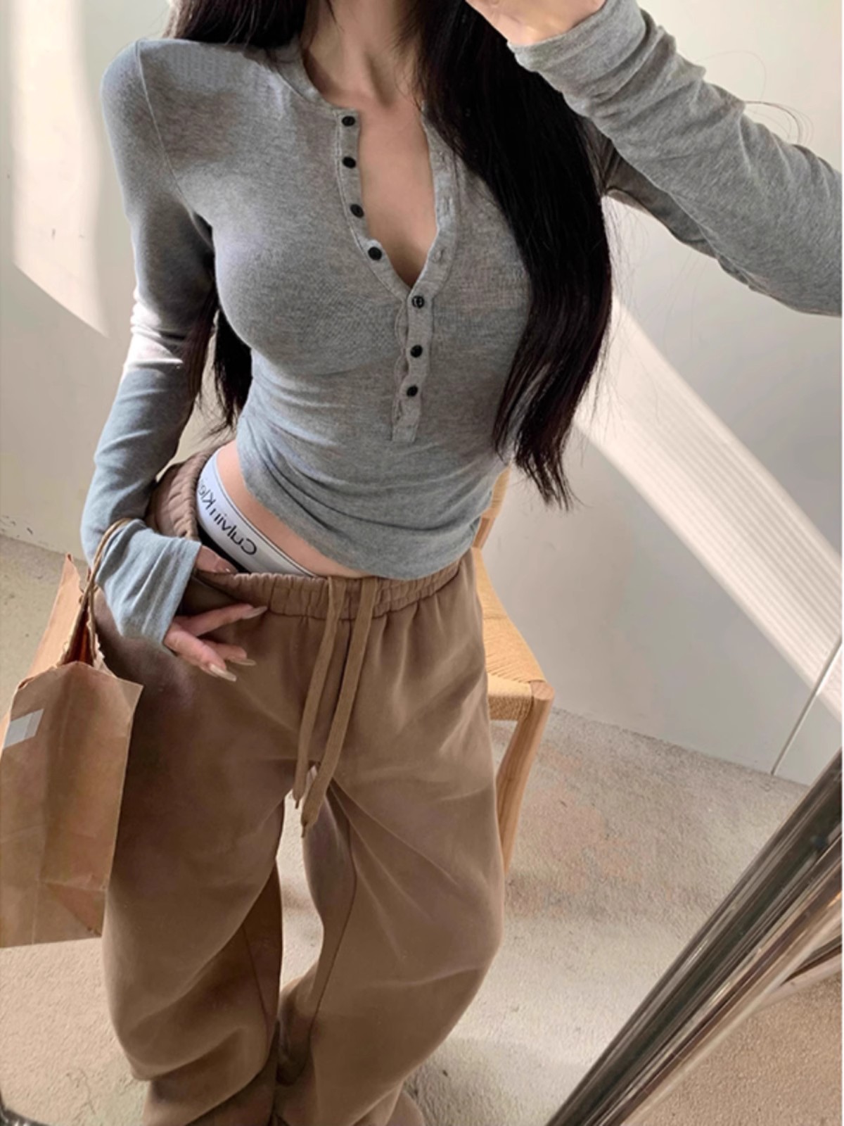 デザイン性の高いニッチなスタイルの巾着VネックショルダーフィットTシャツ、女性用2025春、セクシーでスリムなショート丈長袖トップス