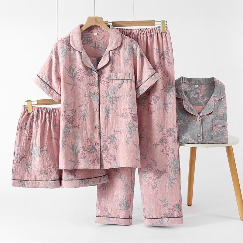女性用パジャマ、先染め純綿ジャカード、春夏二重糸ホームラペル半袖ズボンとショートパンツ、ホームウェア3点セット