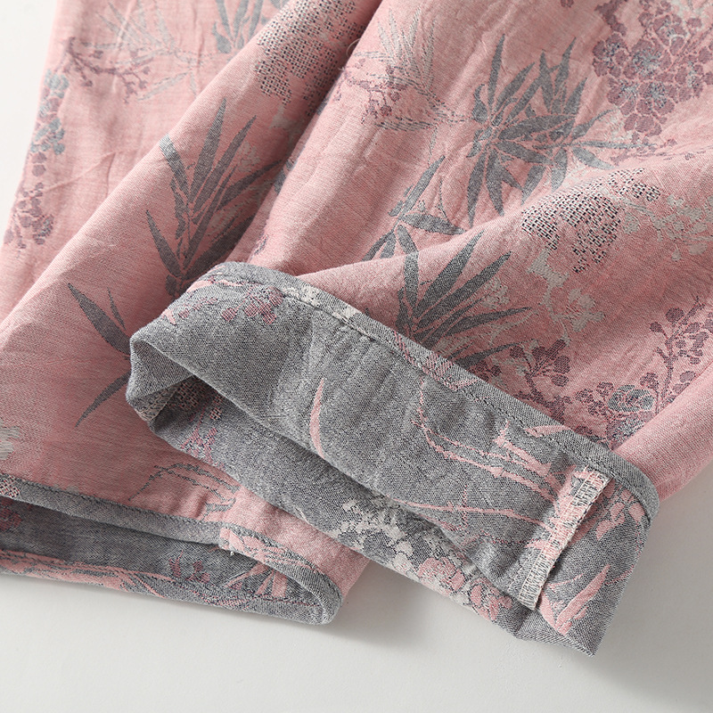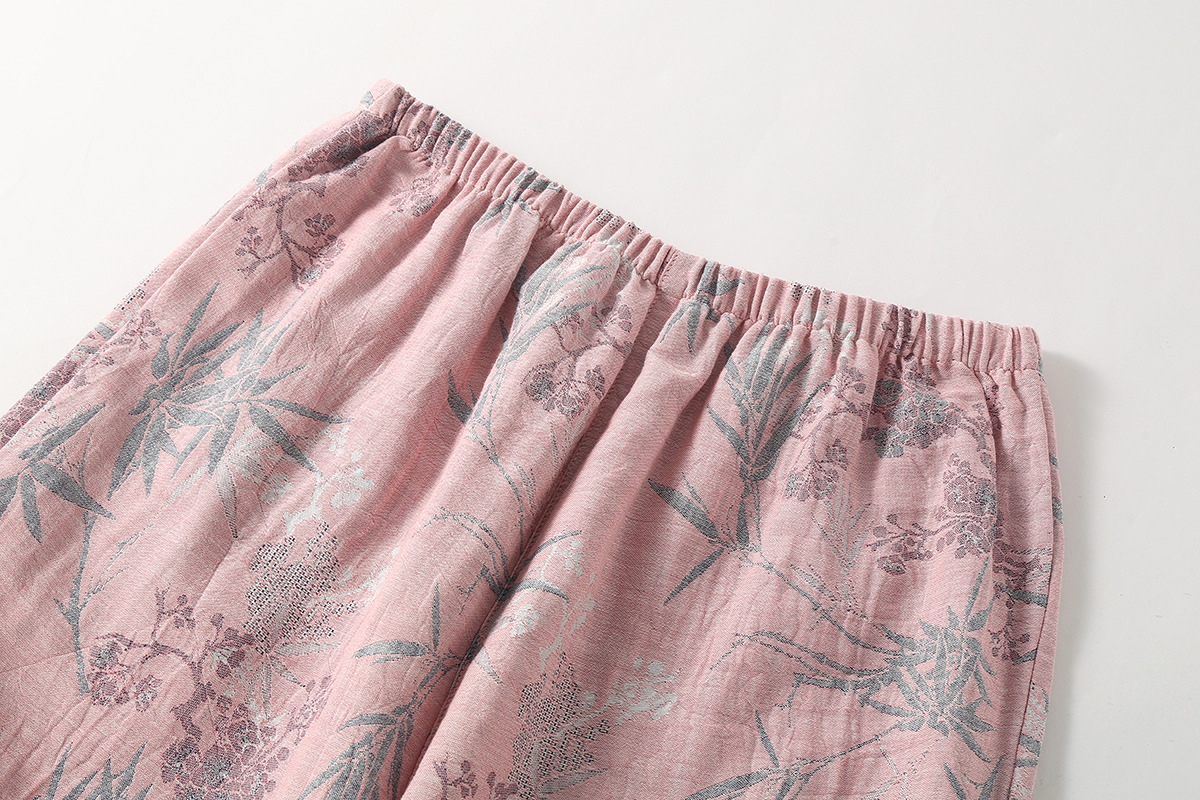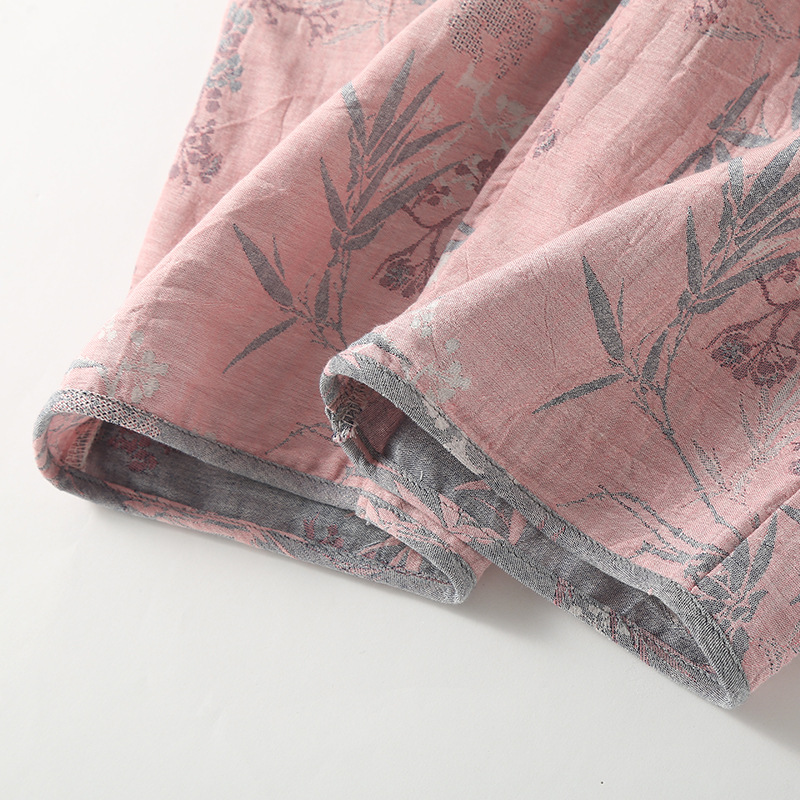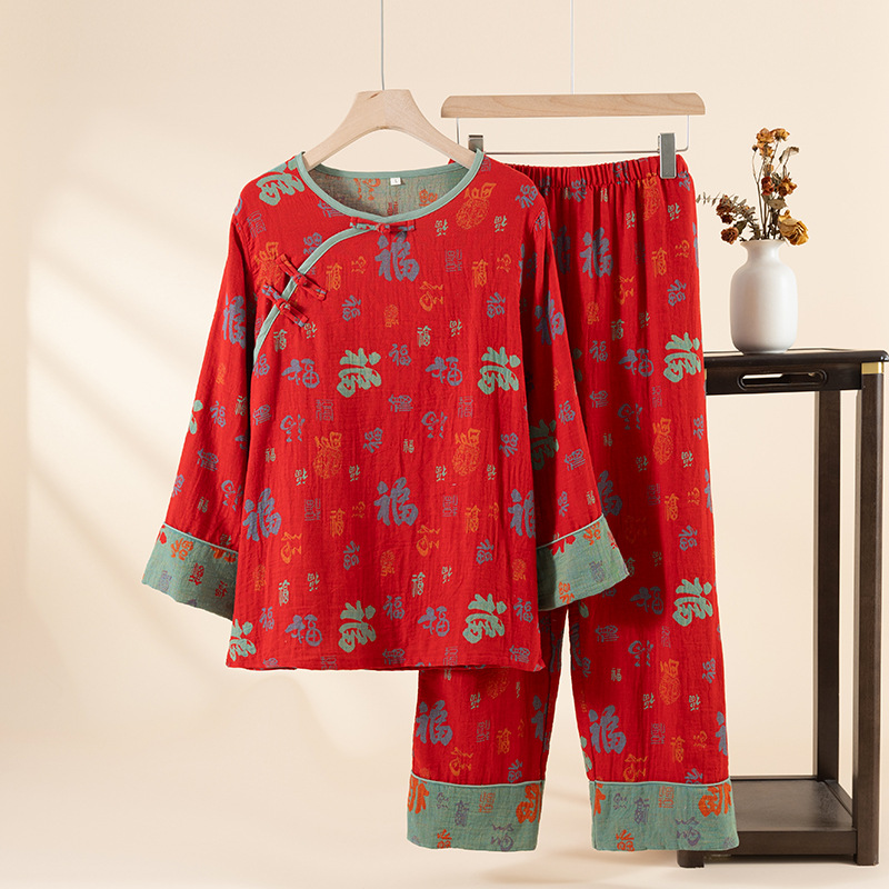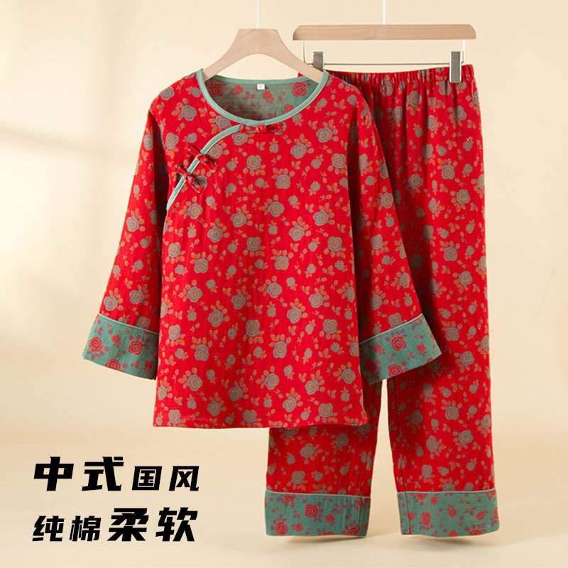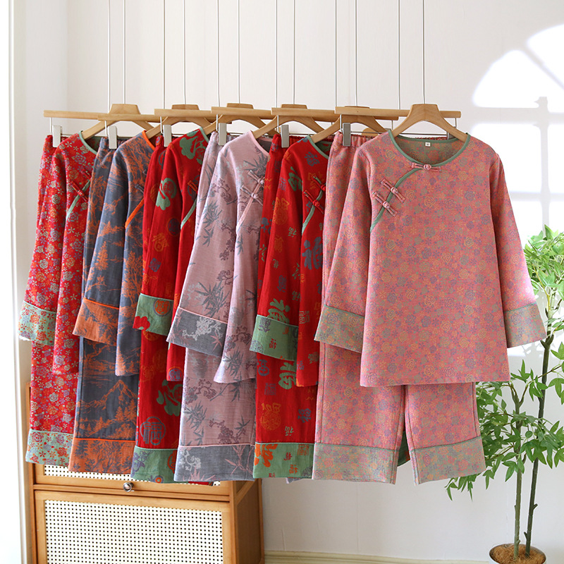 春秋の中国風ナイトウェア、女性用純綿色織ガーゼナイトウェア、九分袖斜め襟ホームウェアセット、外出着としても着用可能