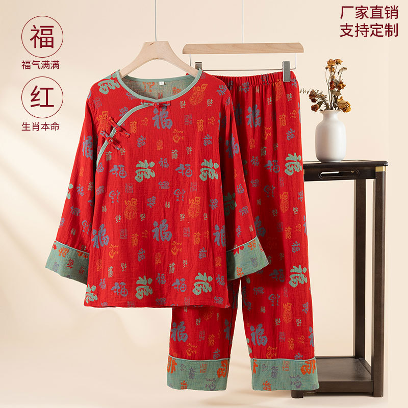 新中国風の赤いホームウェア、女性用純綿パジャマ、春秋夏用、中国の赤い「福」の文字入り、外出着としても着用可能