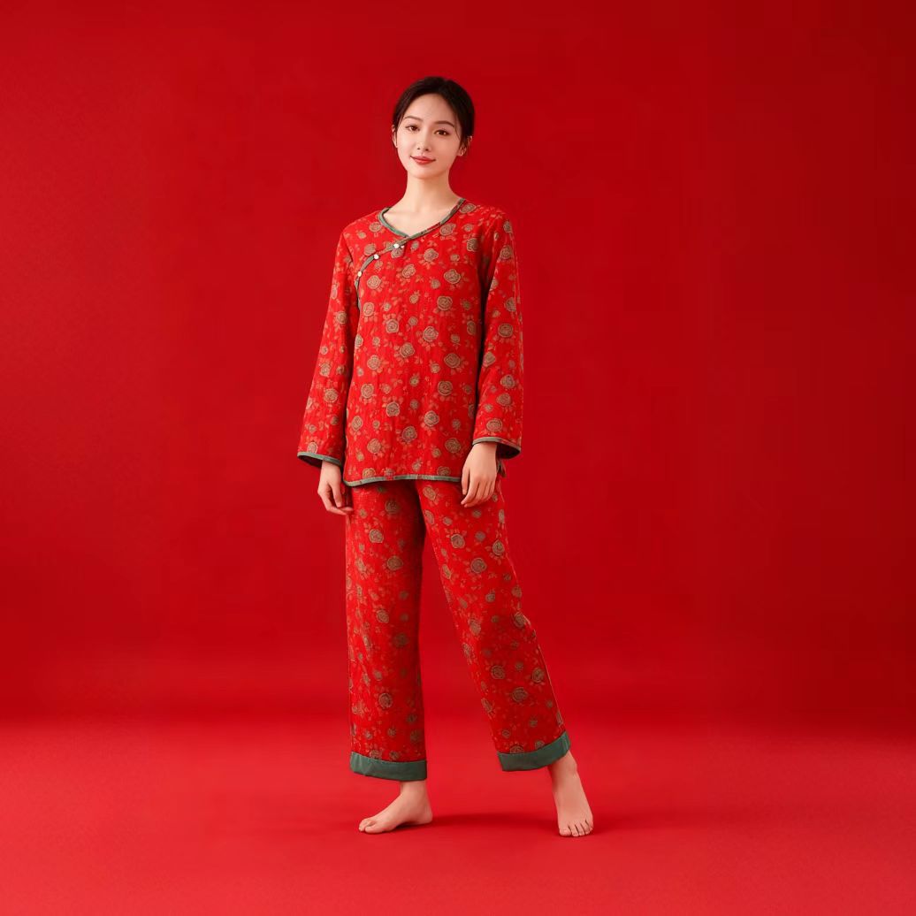 中国風赤色ホームウェア 女性用純綿新中式ボタン付きパジャマ 春秋用 赤福ホームウェアセット