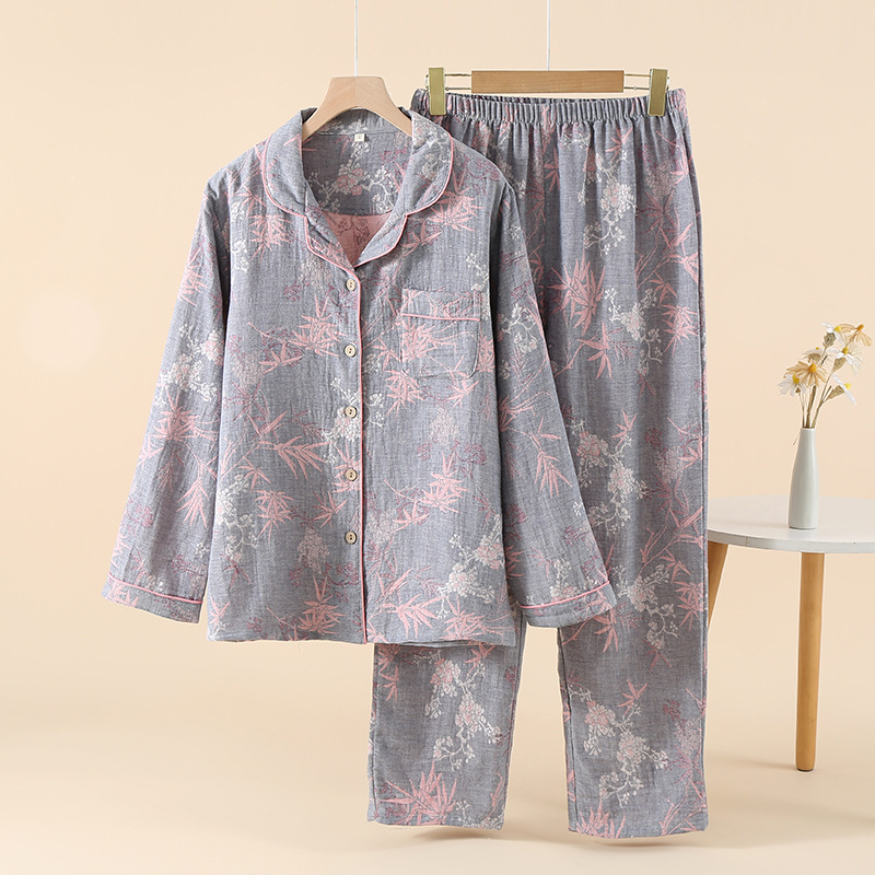 春と秋の新商品パジャマ女性二重ガーゼ男性女性カップル長袖ホームウェアセット