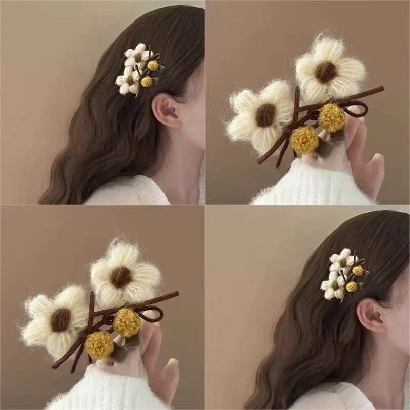 早春新作可爱い毛糸小花ヘアクリップレトロかぎ针高级感カモ口挟みサイド挟み髪饰り