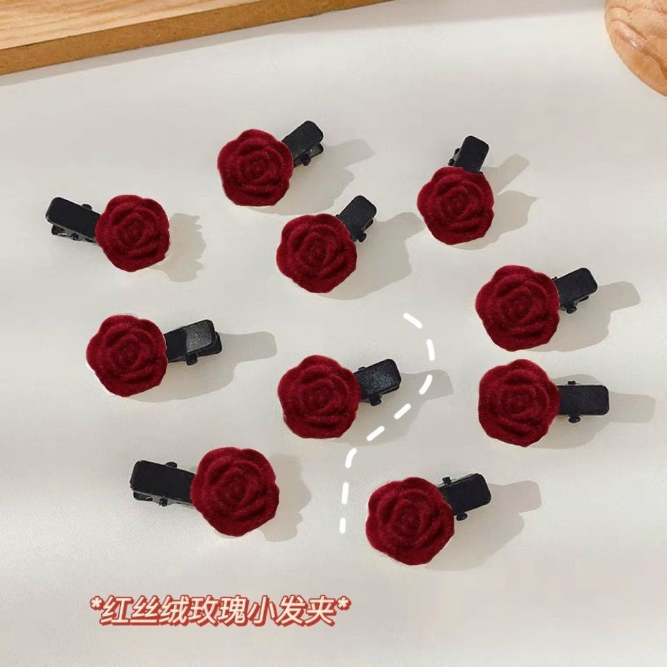 スーパーフェアリーレッドベルベットローズヘアピン〜レッドネットレッドサイドクリップインニッチデザインヘアピン秋冬新作帽子