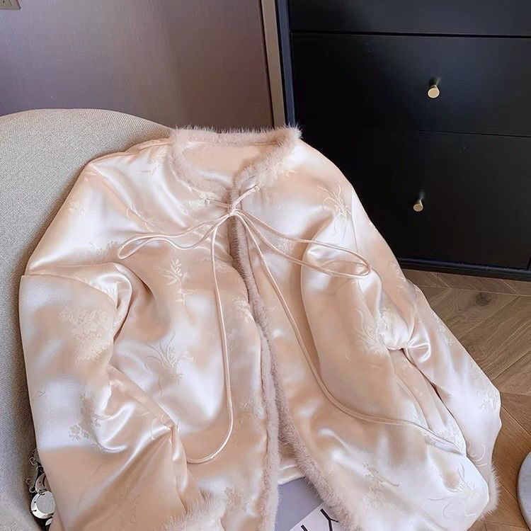新中式棉衣外套禅意国风系带粉色提花毛毛边棉服秋冬女装新款外套