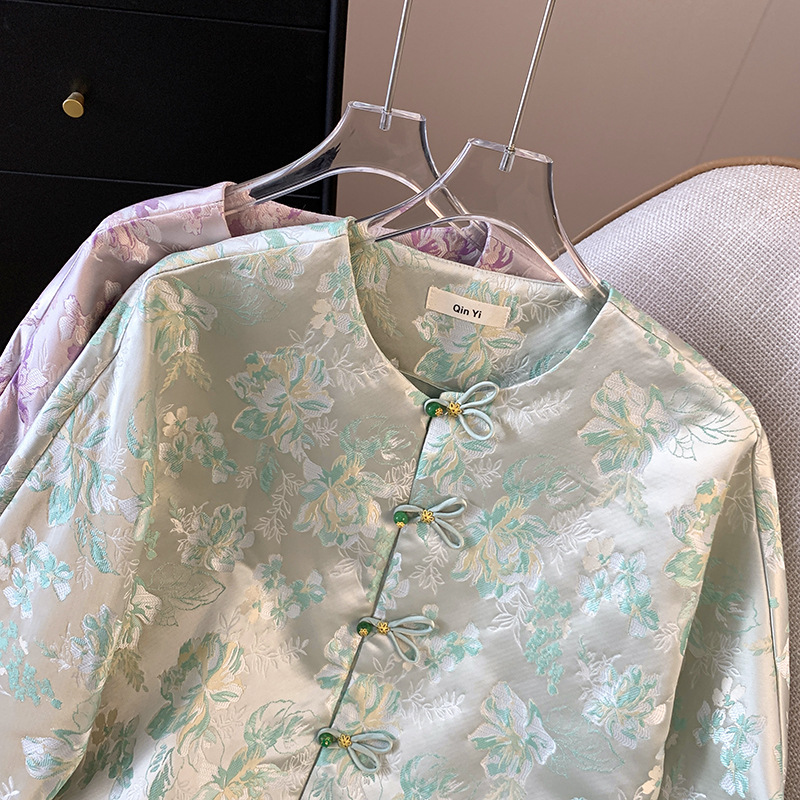 新中国式国風ジャカードの斜め襟のバックルコートの女性2024秋のレトロな高級サテンの改良唐服の上着