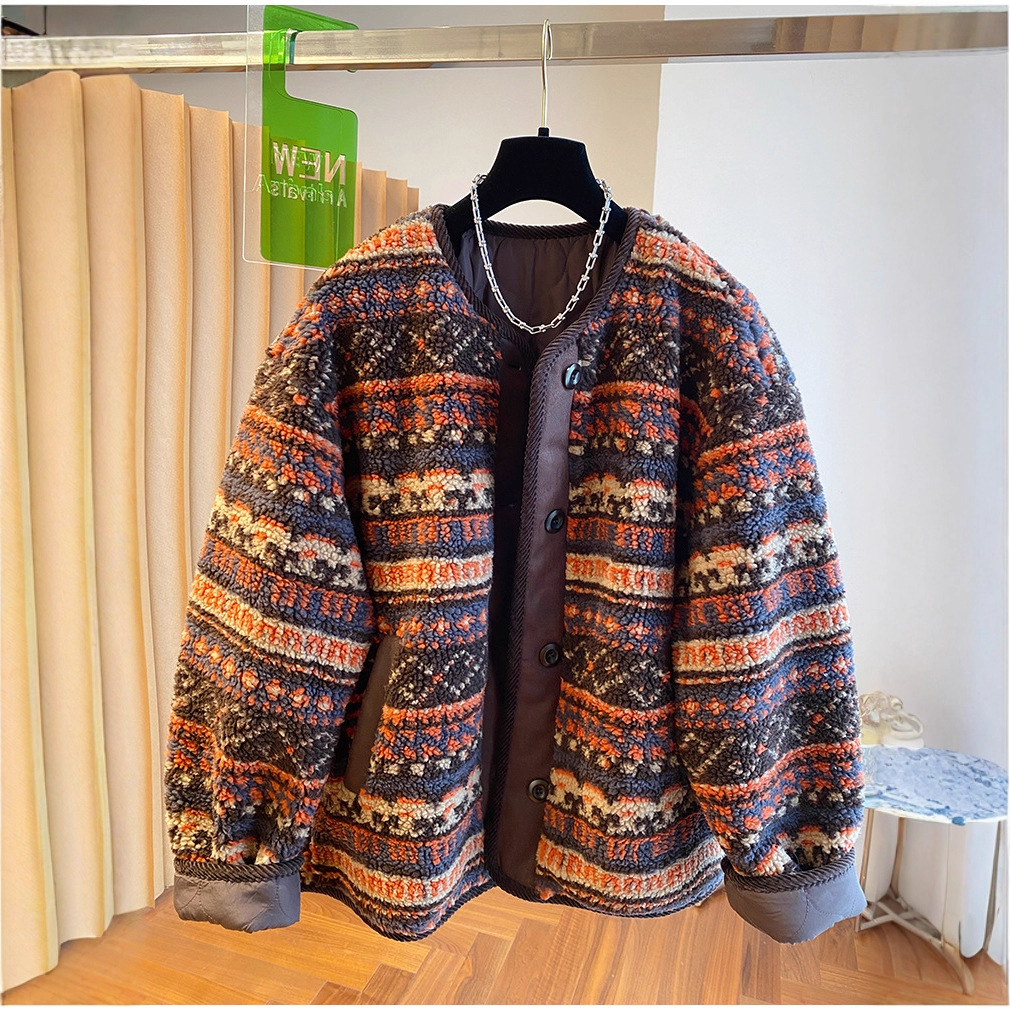 2025新款宽松摇粒绒棉服高级感复古费尔岛仿羊羔毛夹棉外套女冬
