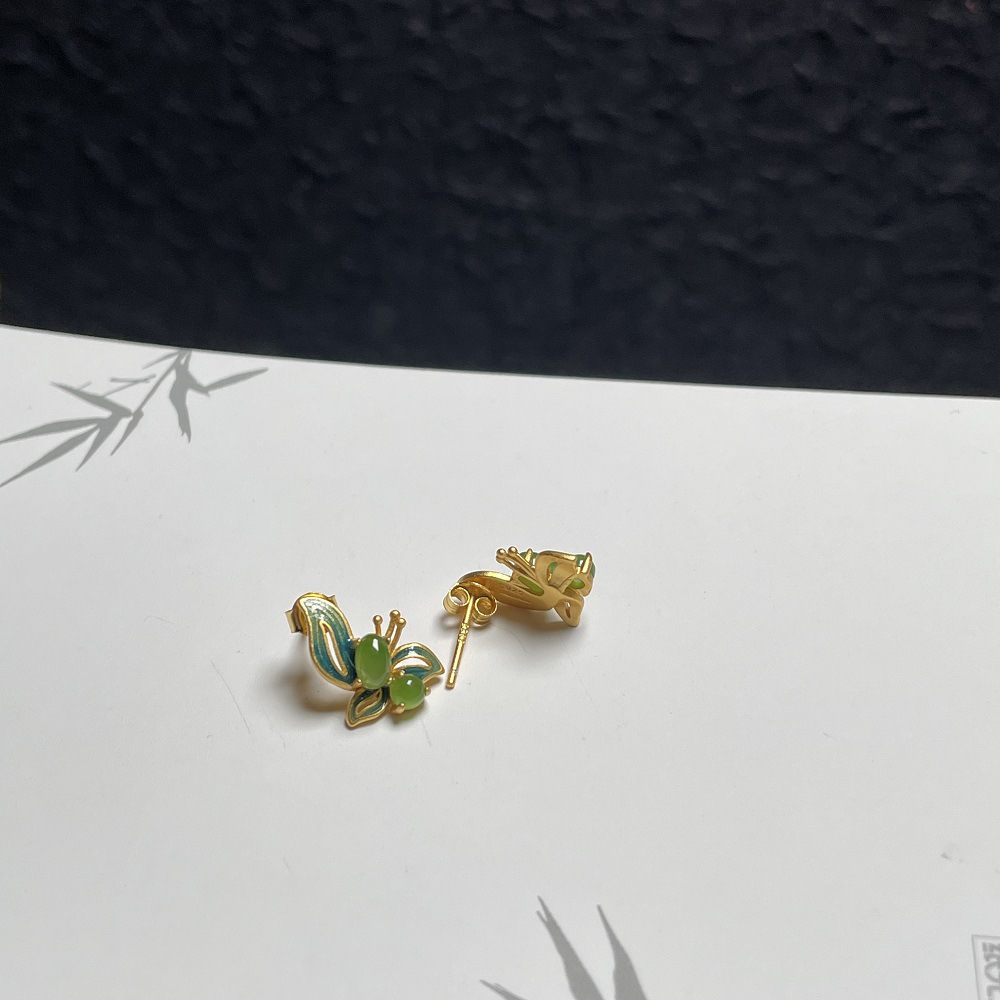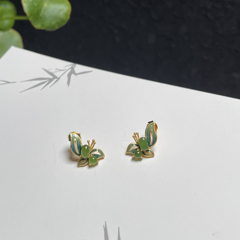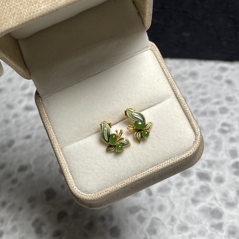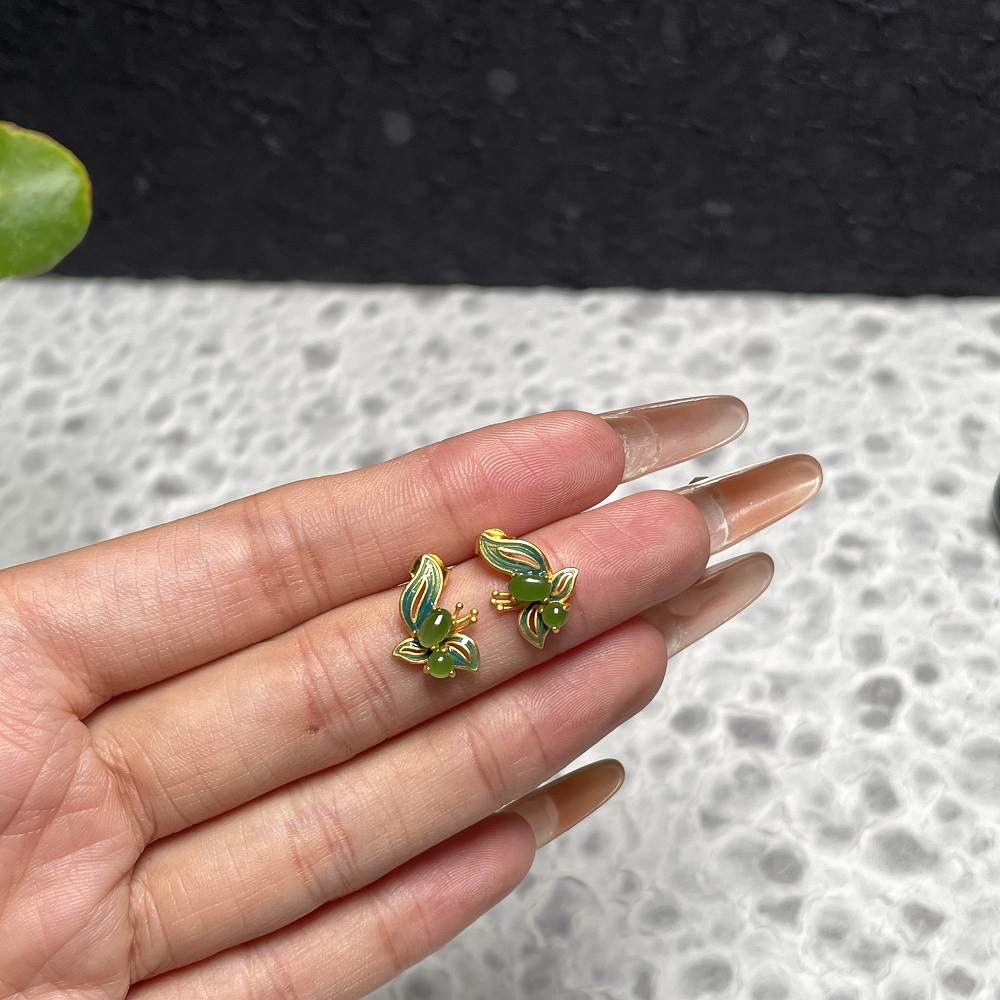 古法銀モザイク和田玉碧玉ファッション卵面ピアス氷透満緑碧玉耳飾り女性モデル
