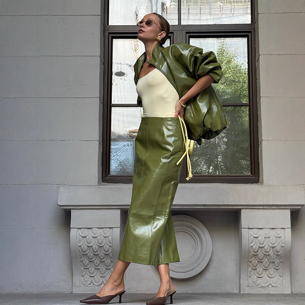 速卖通2025秋季跨境新款欧美气质亮面皮衣套装夹克外套半裙长裙女