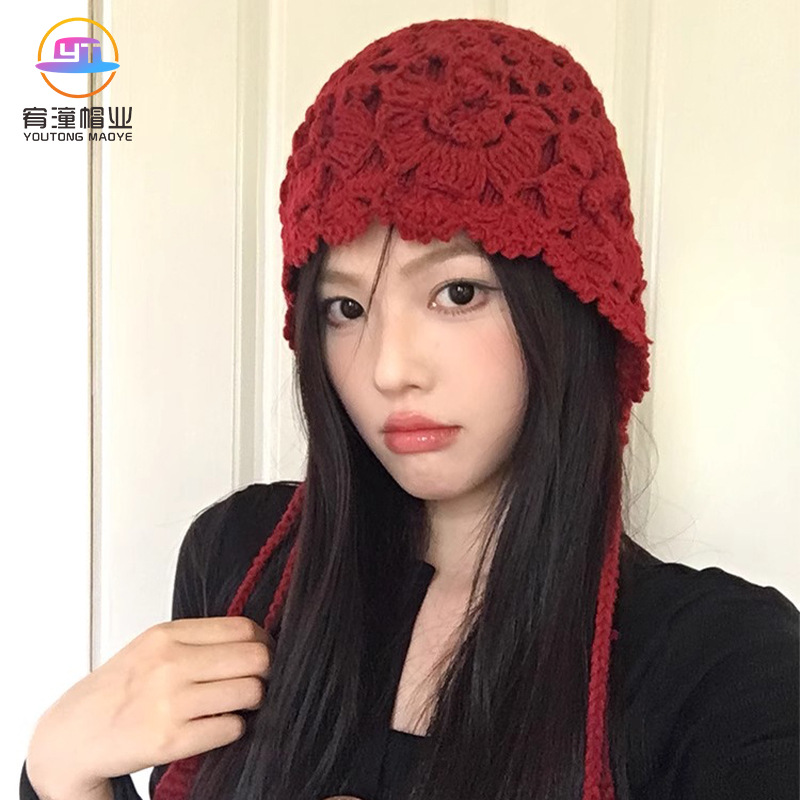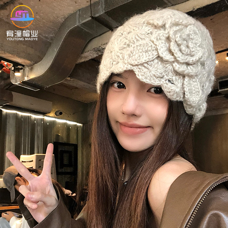 日本の透かし彫りの花の帽子の女性の秋冬の新型の百合の顔の小さい冷たい帽子の防寒の保温の毛糸の帽子