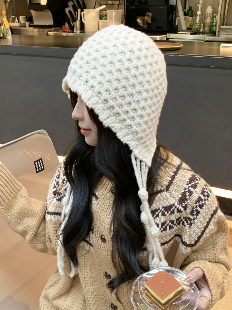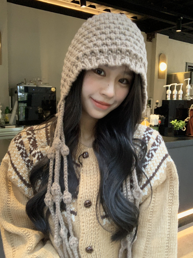 秋冬の女性の頭の周りの頭の帽子は顔が小さくて、耳の保温帽を厚くして、手で編んだフリンジニットの帽子です。