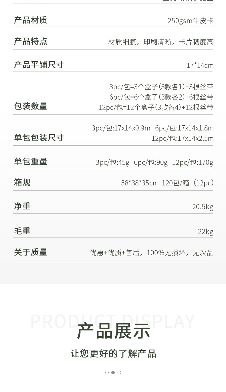 12pc/包=12个盒子(3款各4) +12根丝带 ; 17x14x2.5m 170g;