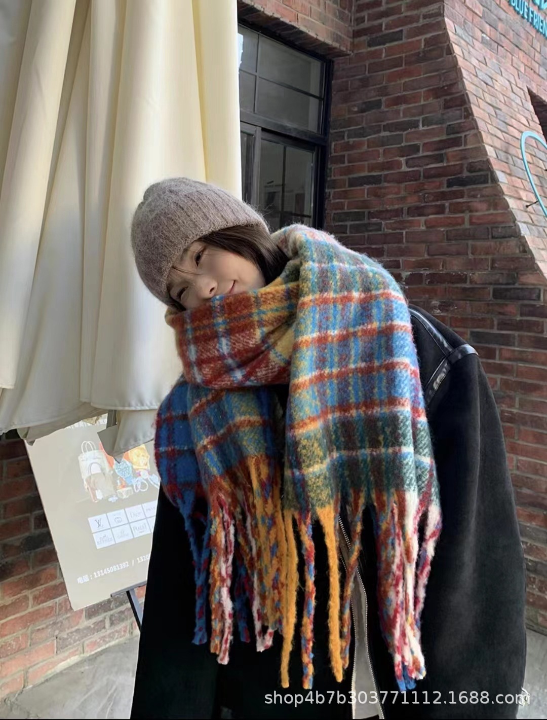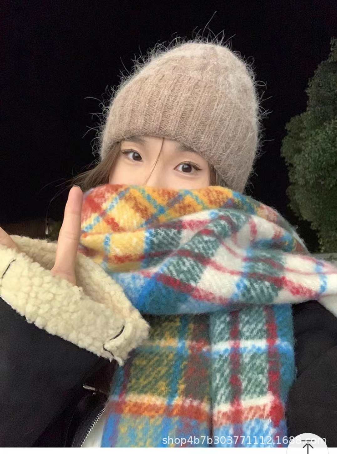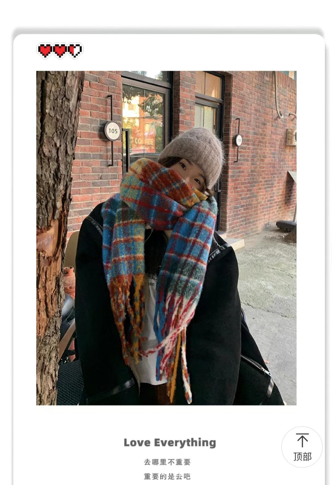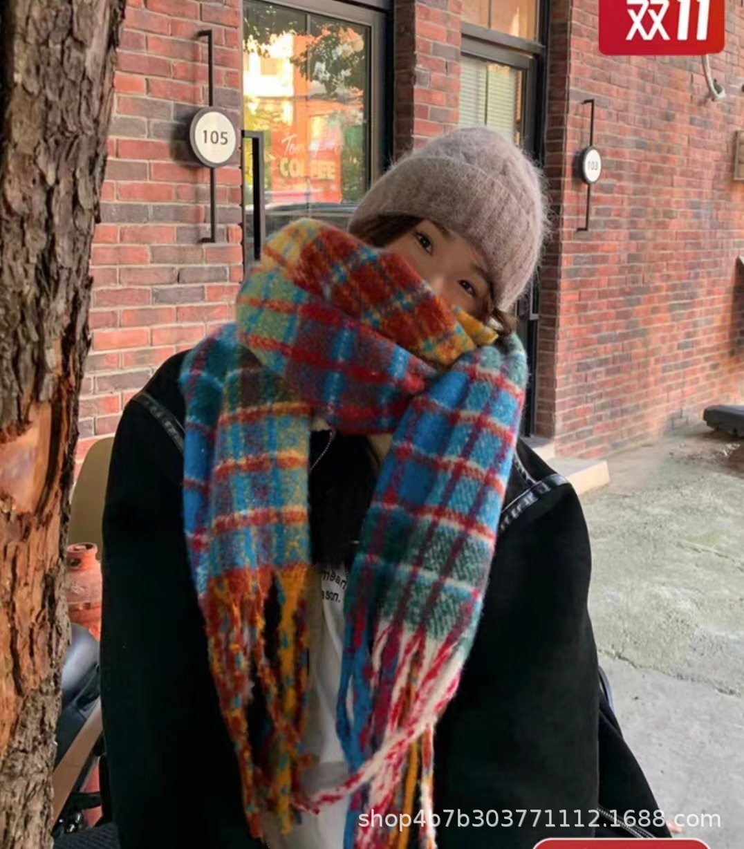 レトロ七色格子馬海毛美ラード丁香格マフラーを厚くして保温して首を囲む学生カップル日韓