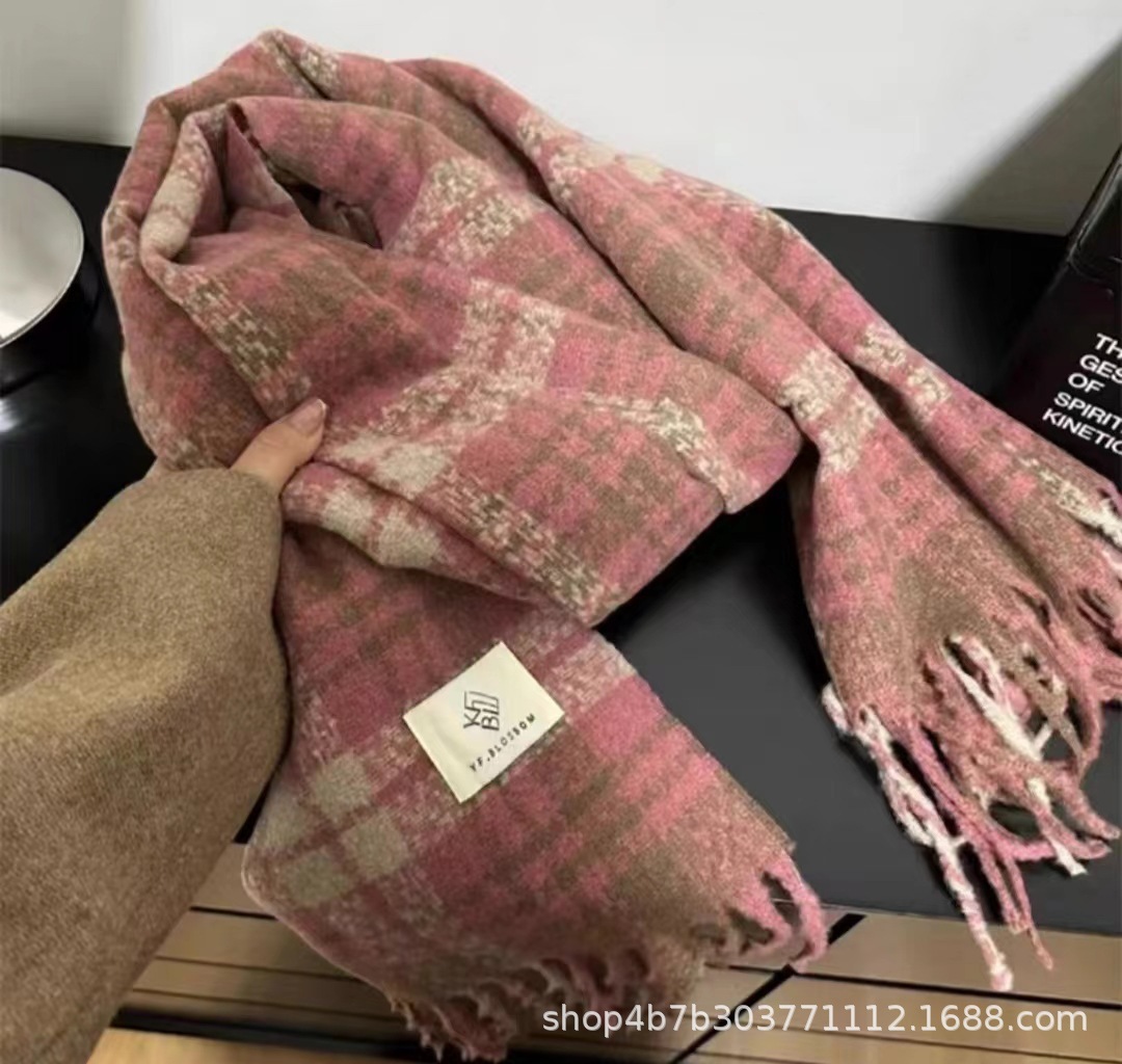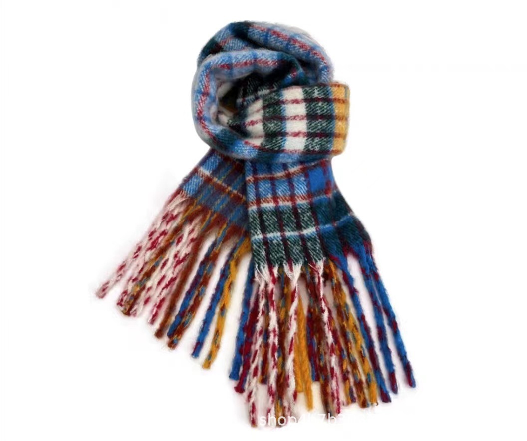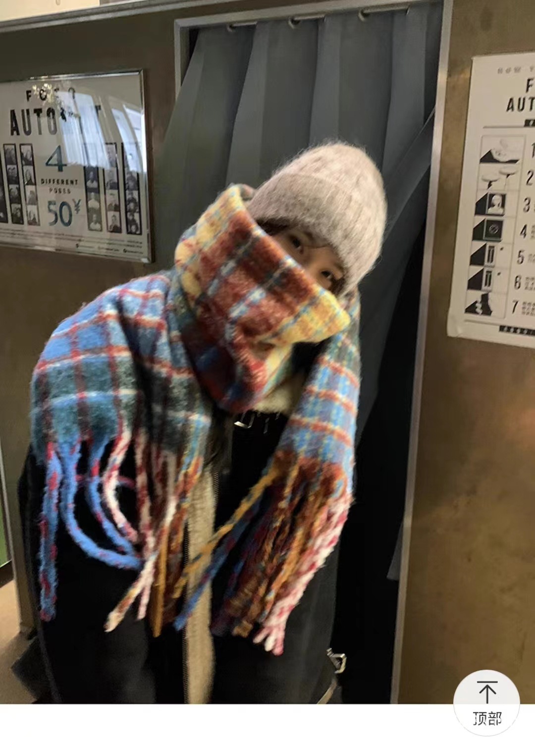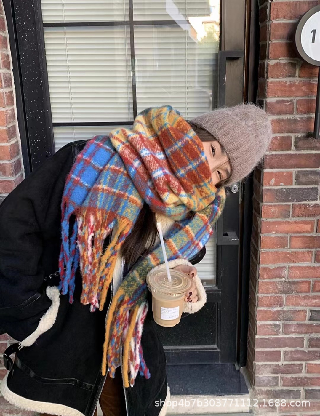 レトロ七色格子馬海毛美ラード丁香格マフラーを厚くして保温して首を囲む学生カップル日韓