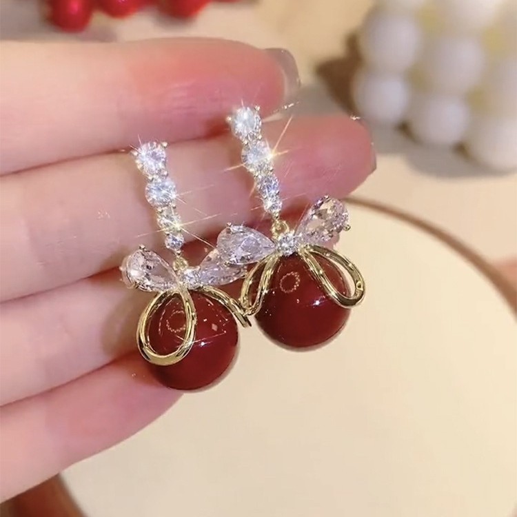 高級感超フラッシュジルコン蝶結び新年おめでとう赤真珠銀針イヤリング女性百合大気耳飾り