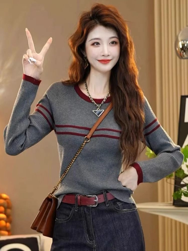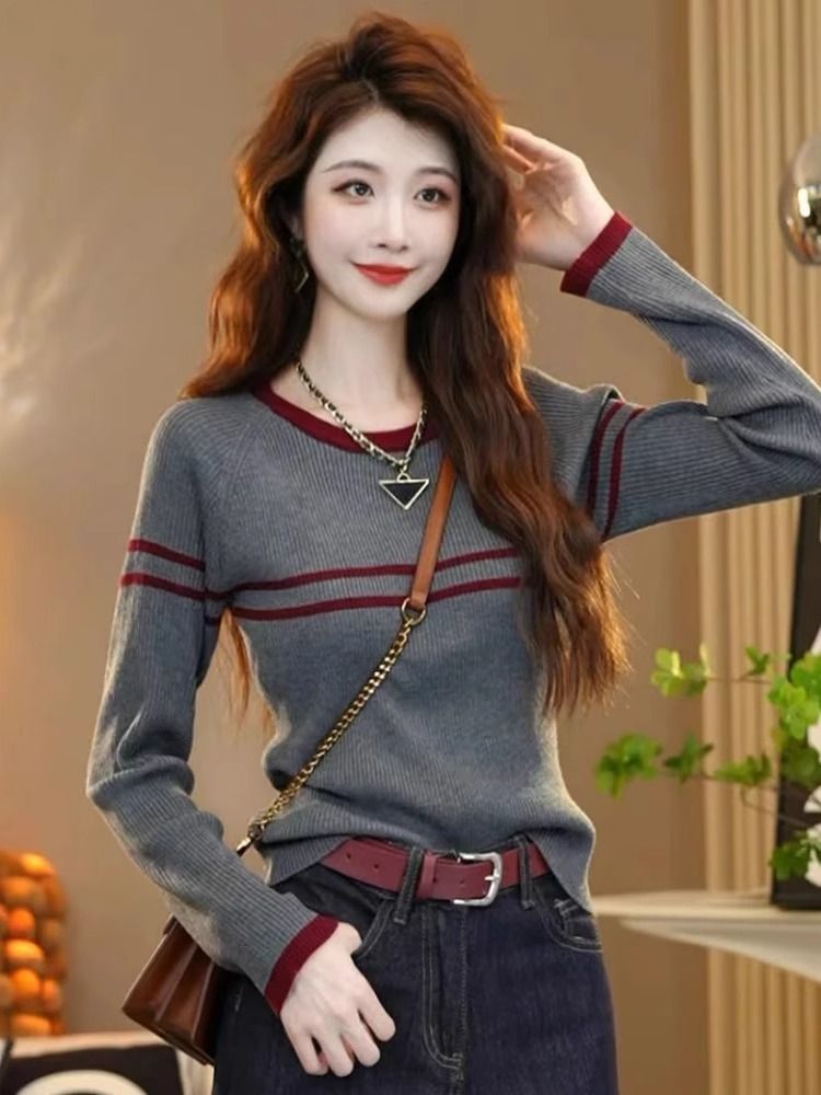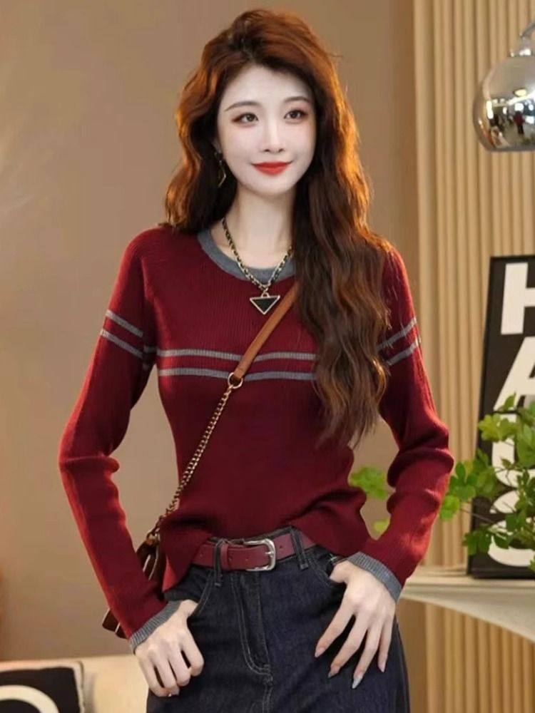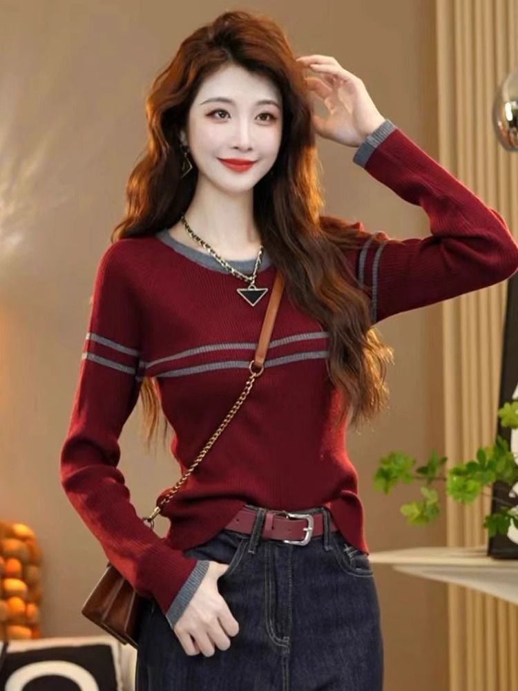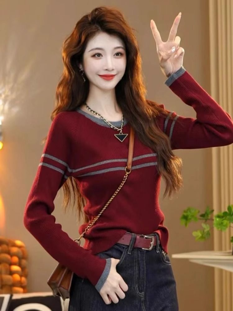 今年はアンゴラの赤い丸首の長袖のストライプの復古の底のシャツが流行します。
