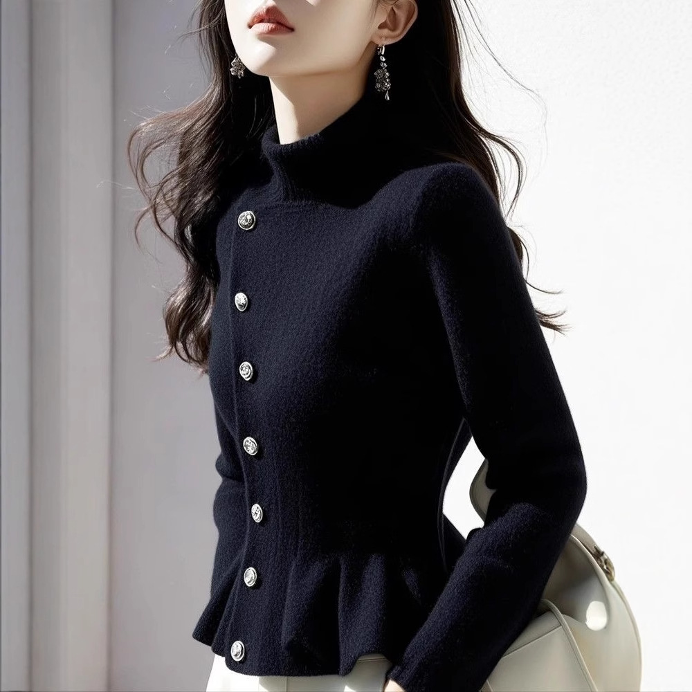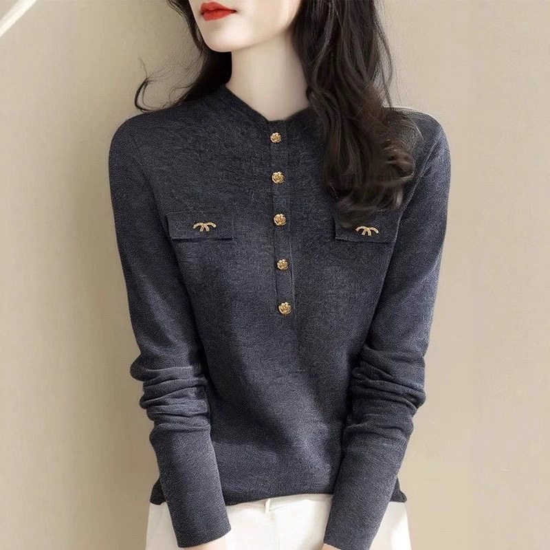 【80-135斤】小香风上衣女秋冬半高领针织衫纽扣别致长袖打底衫女
