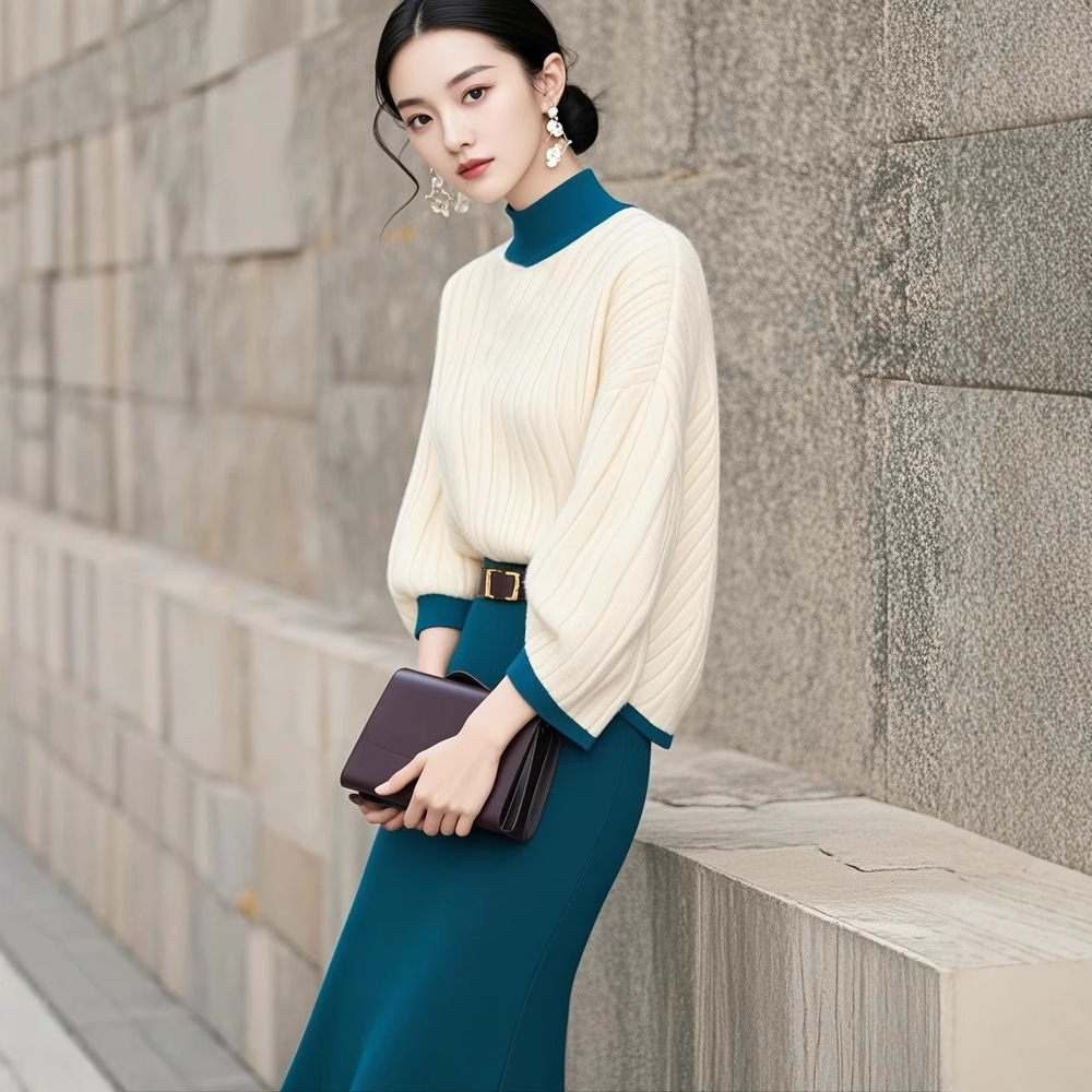 今年流行搭配一整套女秋冬新款高领针织毛衣半身裙漂亮好看两件套