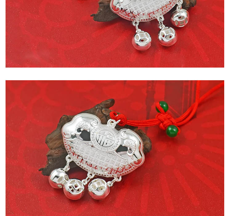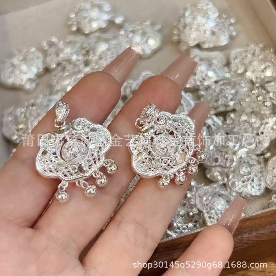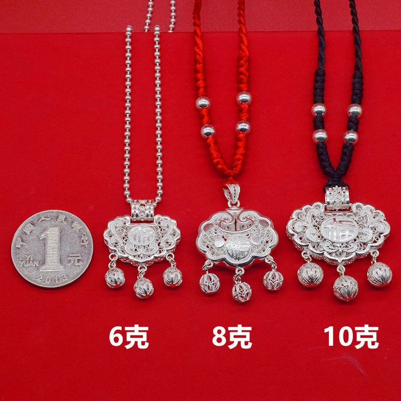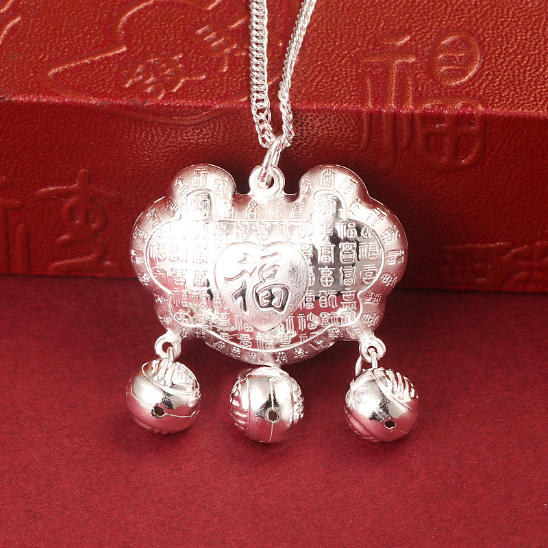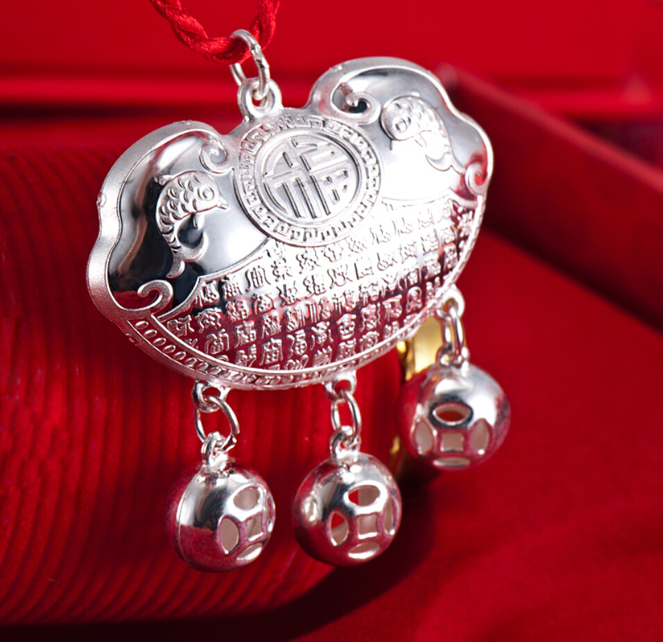 S999足银平安如意花丝平安锁女新中式吊坠铃铛镂空长命锁银饰批发