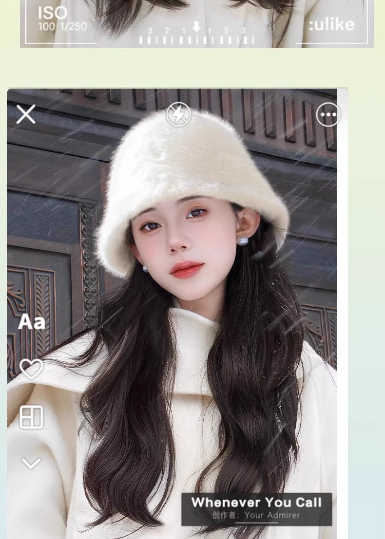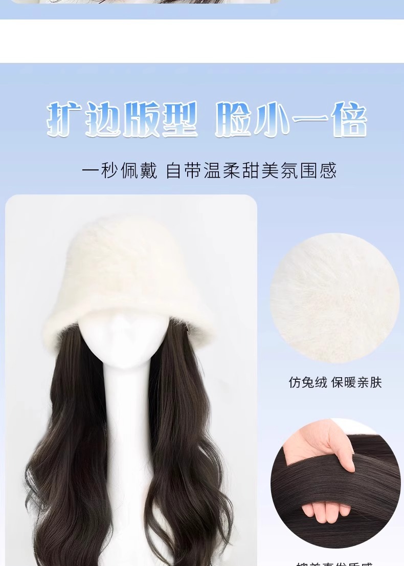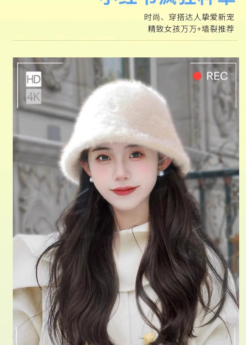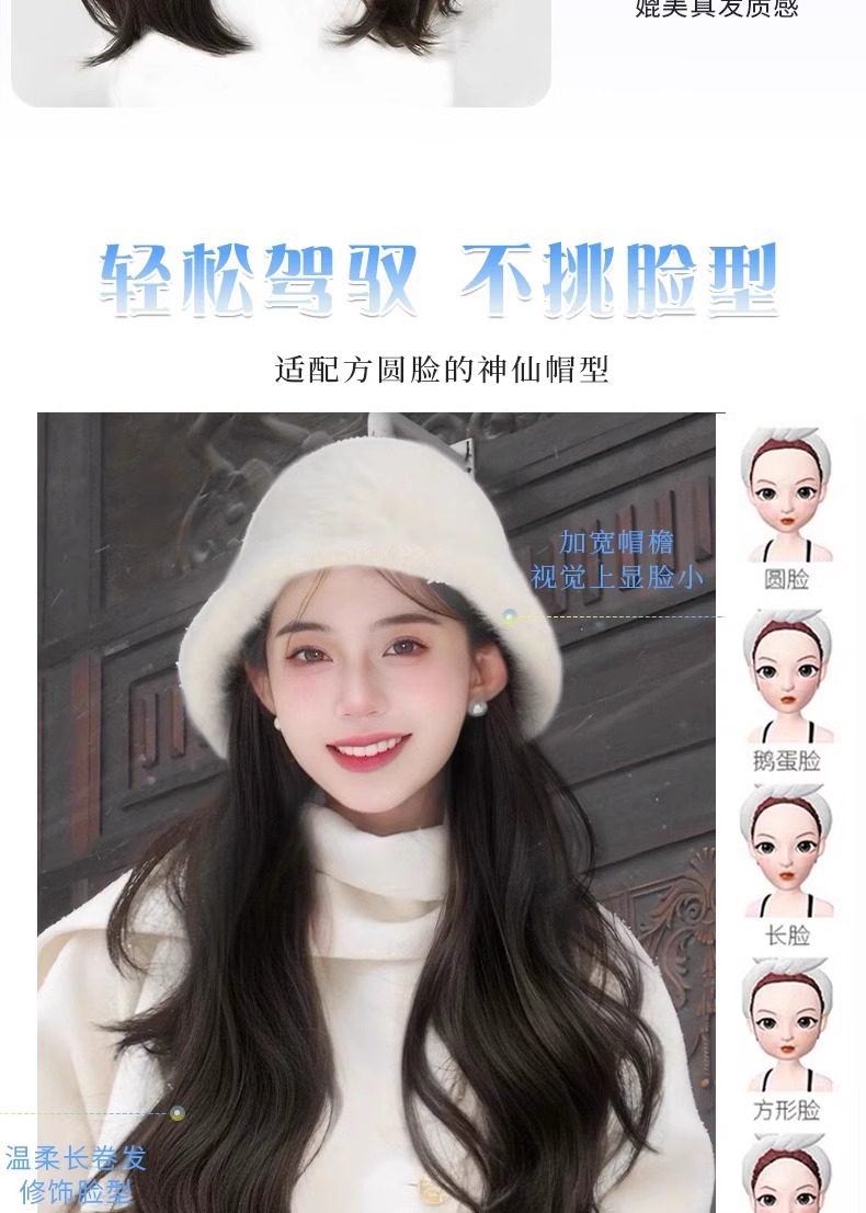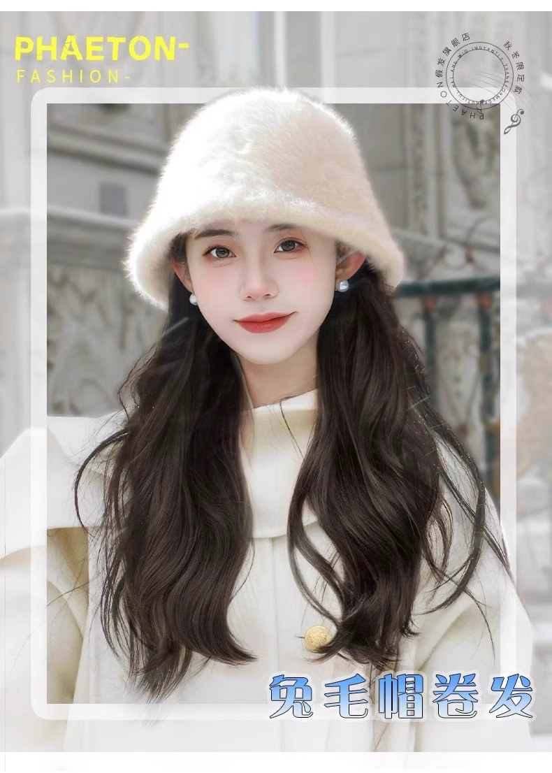 2025新型帽子かつら全頭カバー秋冬毛ウサギ毛漁師帽微巻大波白ウサギ毛帽