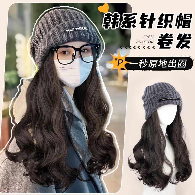 帽子假发一体时尚全头套女款2025新款仿真发大波浪发秋冬季针织帽