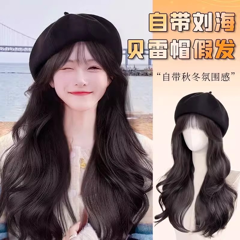 ベレー帽女性秋冬顔小かつら帽子一体新型ファッション自然全頭カバー長巻き髪前髪付き