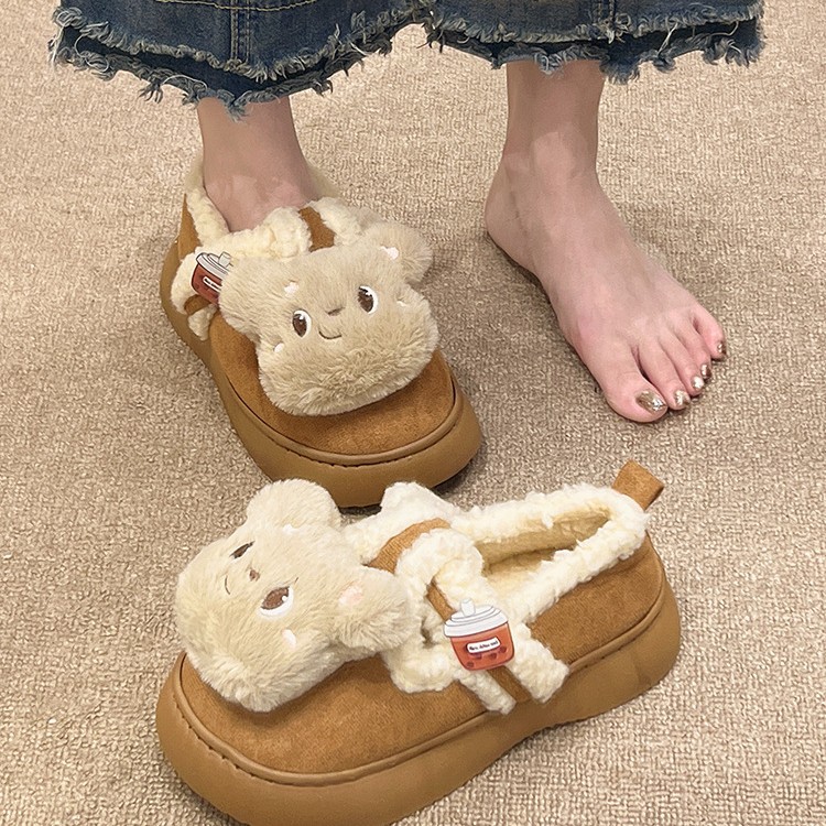 冬のバッグと靴の女性はかわいい熊のバッグと厚い底の滑り止めの室内の家にベルベットの保温毛綿の靴を着ている