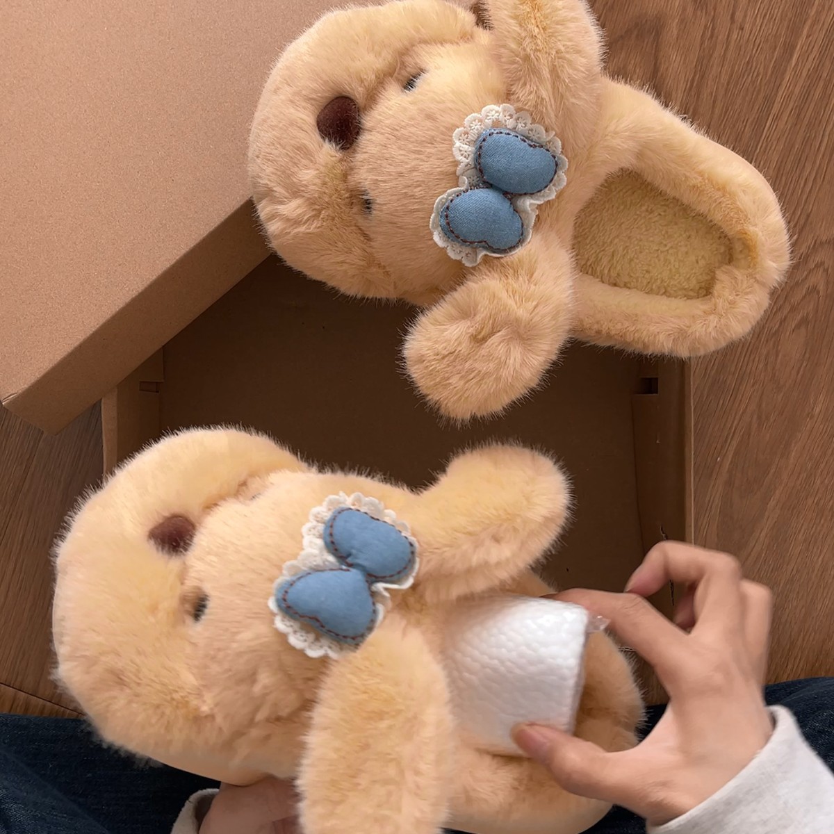 网红可爱蓝色蝴蝶结小狗毛毛拖鞋女2025秋冬新款厚底百搭包头拖鞋