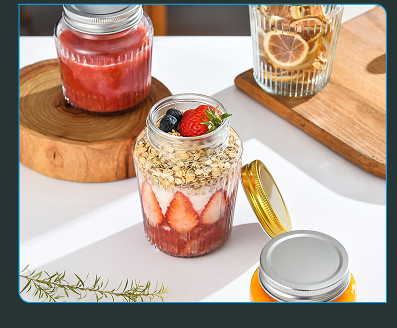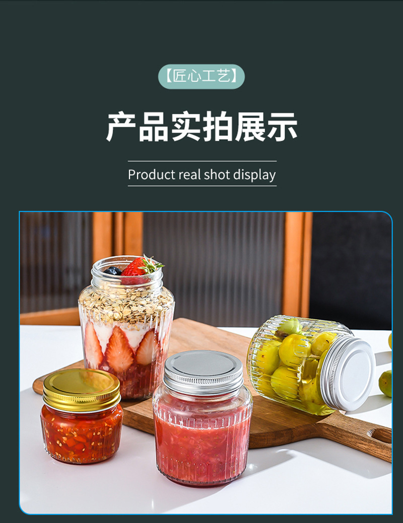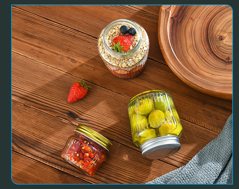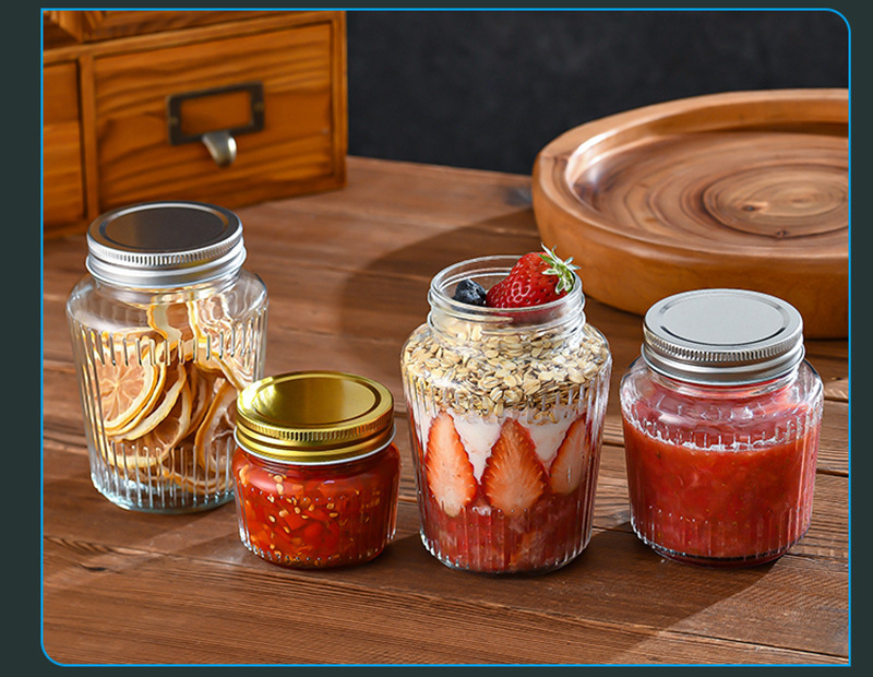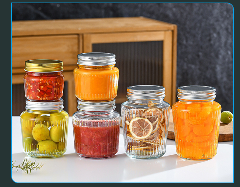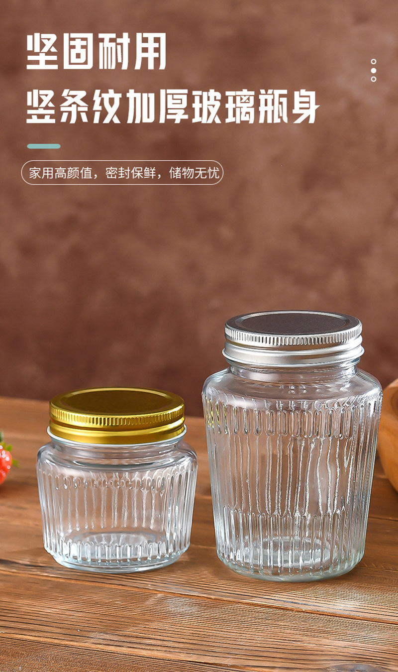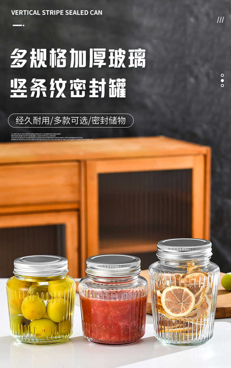 カスタマイズされた透明な縦縞ガラス密封瓶カーリングアルミ蓋ピクルスボトル透明ガラスドライフルーツと穀物保存瓶