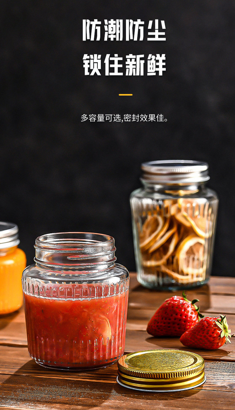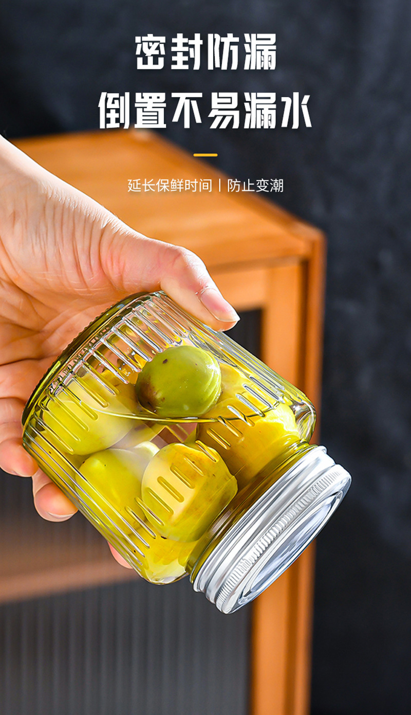 透明縦縞ガラス密封瓶、巻き縁アルミ蓋、漬物瓶、乾物・穀物保存瓶、厚手メイソンジャー
