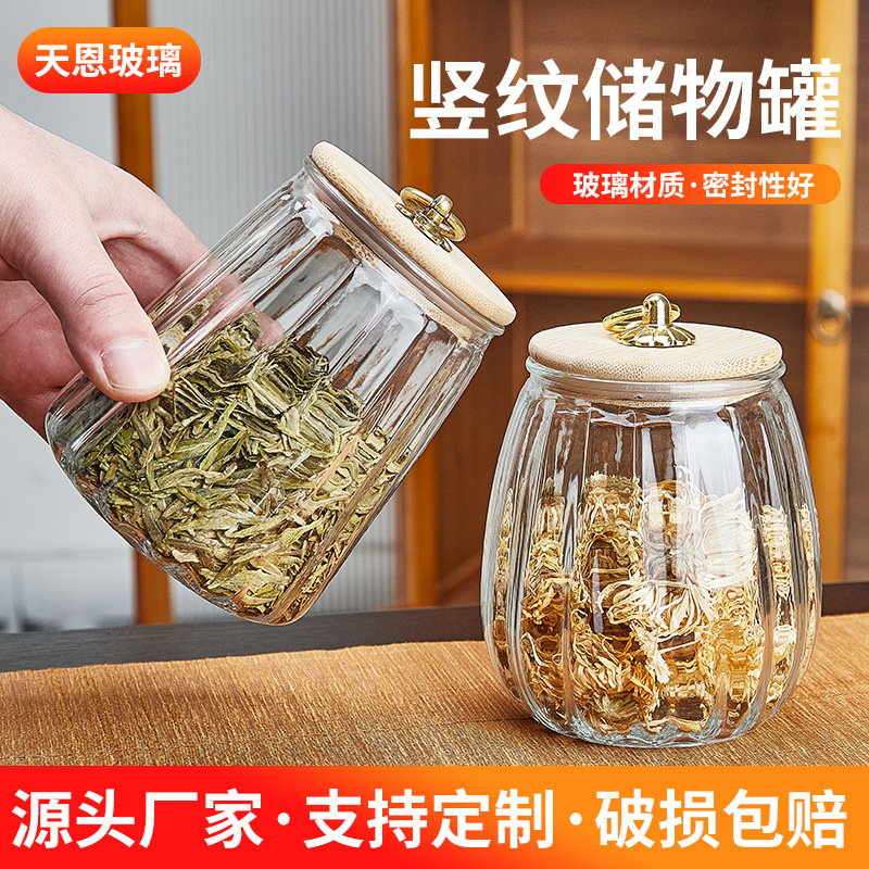 カスタマイズされた縦パターンの透明な保存瓶コーヒー豆茶瓶透明ガラス密封瓶竹蓋花茶瓶