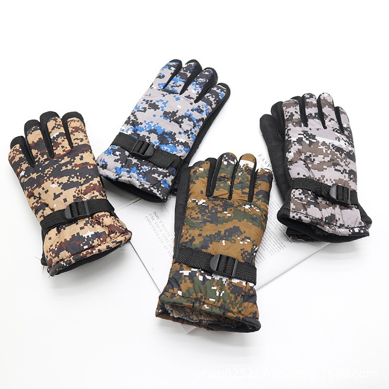 アウトドアサイクリング用厚手保温迷彩手袋、冬用防風防寒自転車用、裏起毛、大型綿、滑り止め