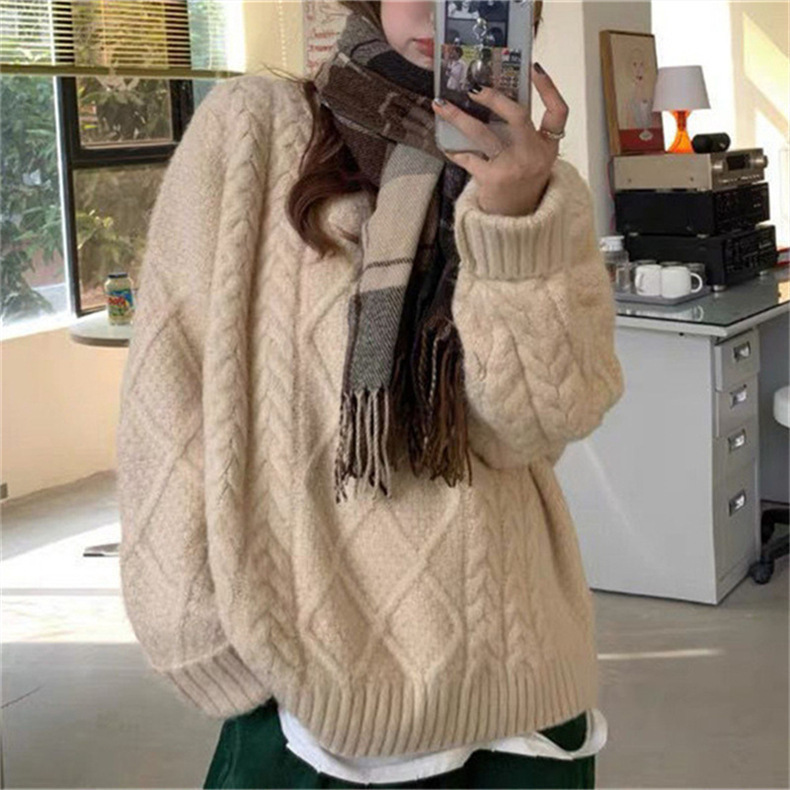 2025秋冬新款套头毛衣女慵懒风宽松纯色麻花显瘦日系圆领外穿针织
