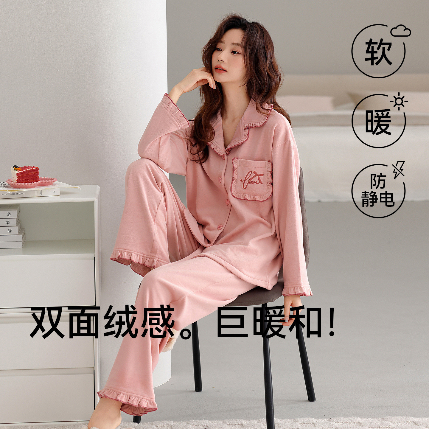 海岛绒睡衣女秋冬新款翻领开衫纯色大码加厚保暖家居服女士套装