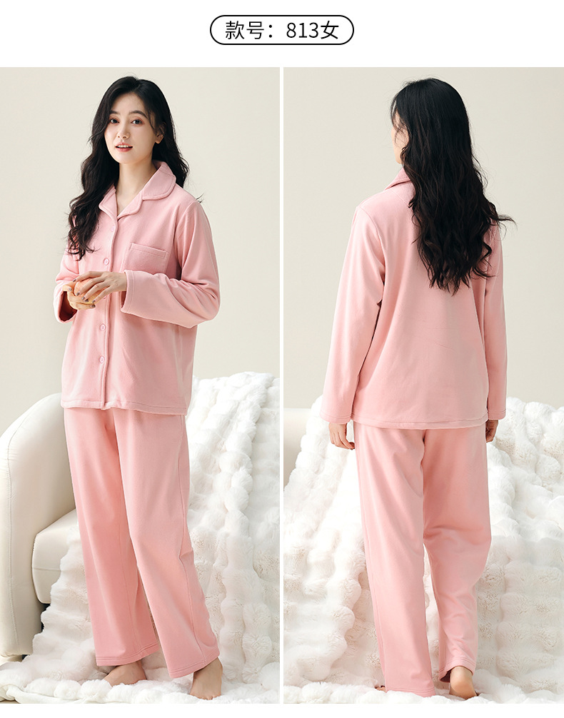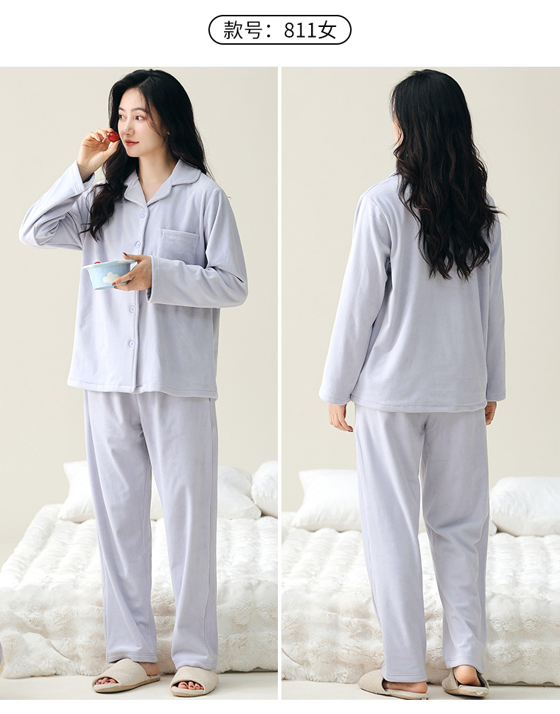 珊瑚绒睡衣女秋冬翻领开衫纯色大码法兰绒加厚长袖简约保暖家居服