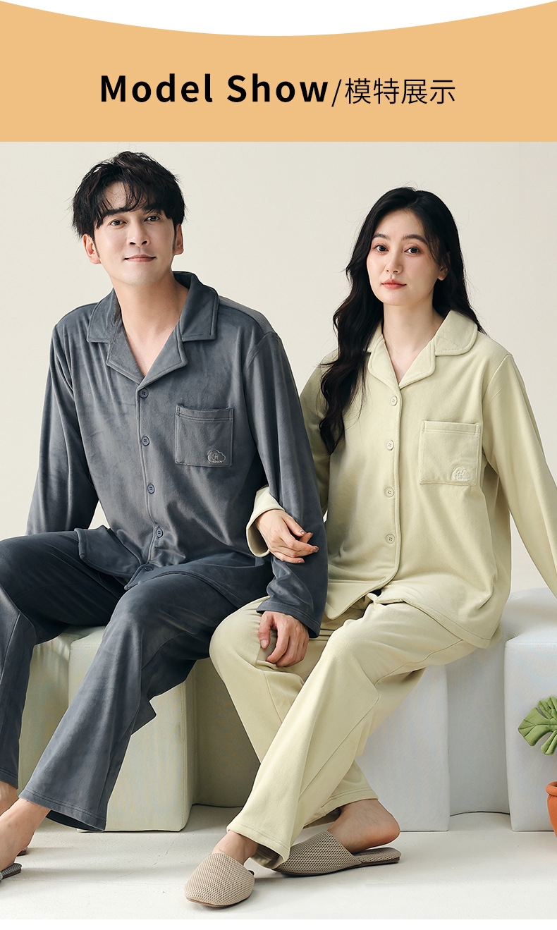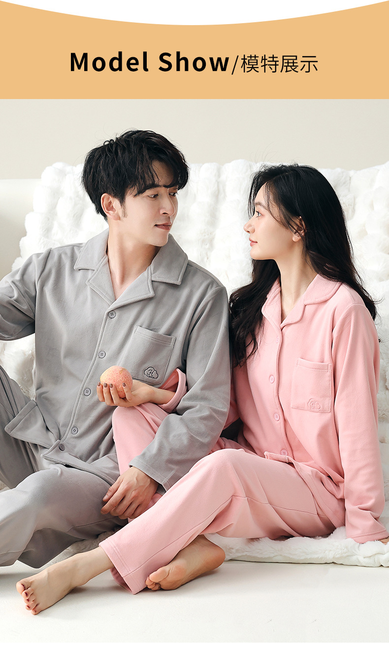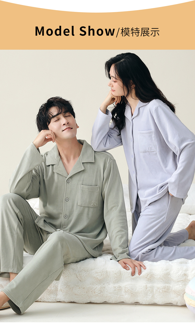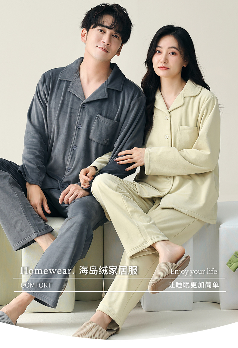 新款情侣睡衣海岛绒长袖厚款家居服加绒加厚保暖纯色大码开衫套装
