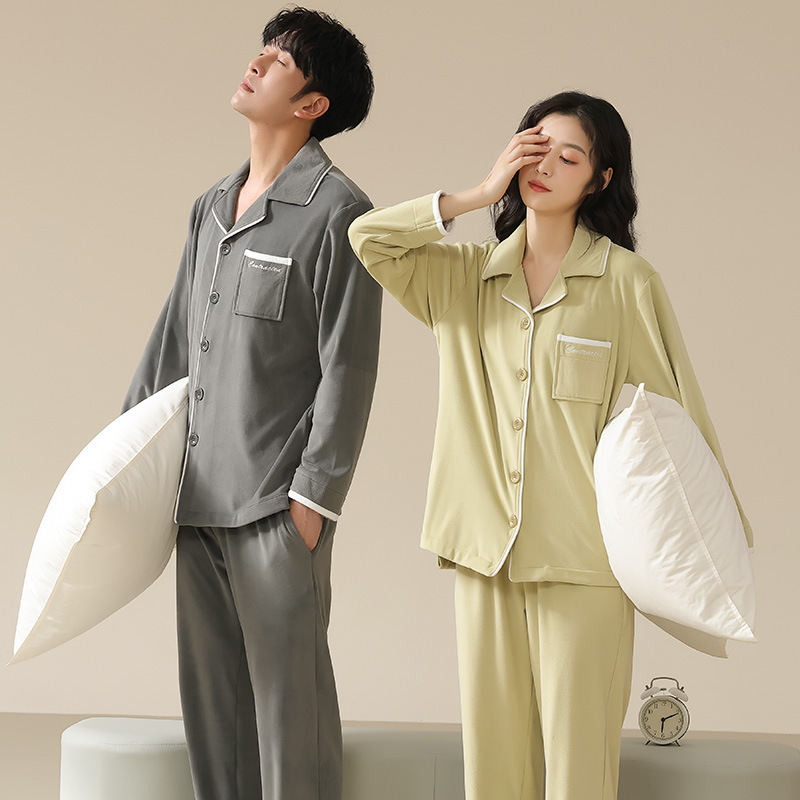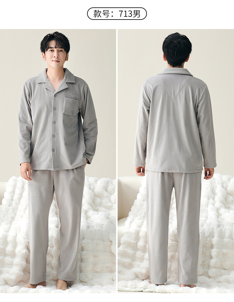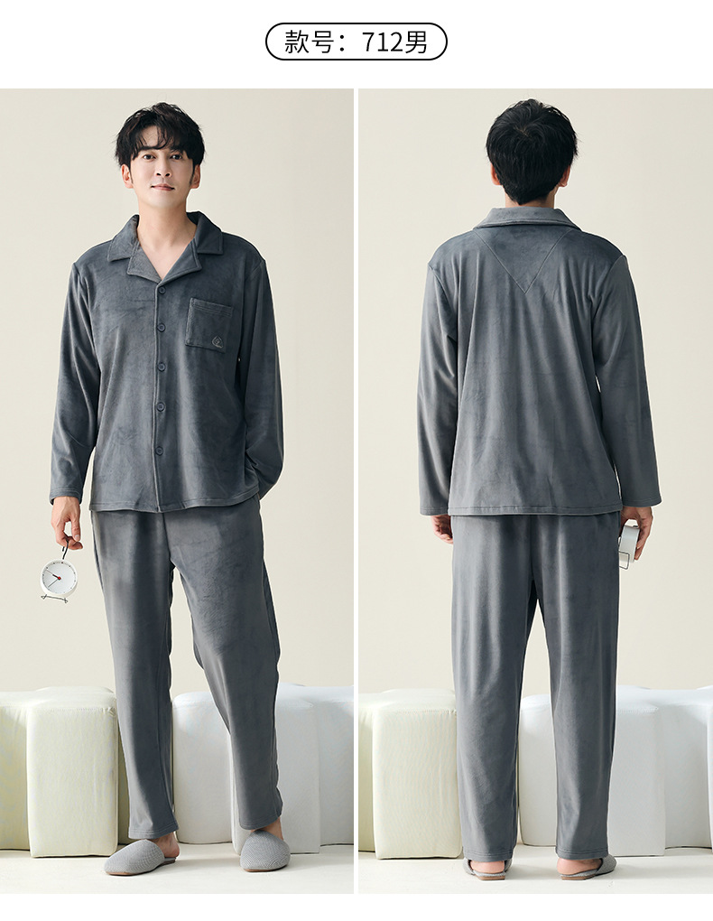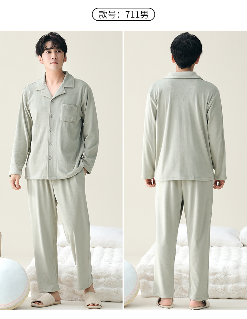 カップル海島絨毛家服襟折りカーディガン長袖長ズボン男性純色大サイズ保温パジャマ2点セット
