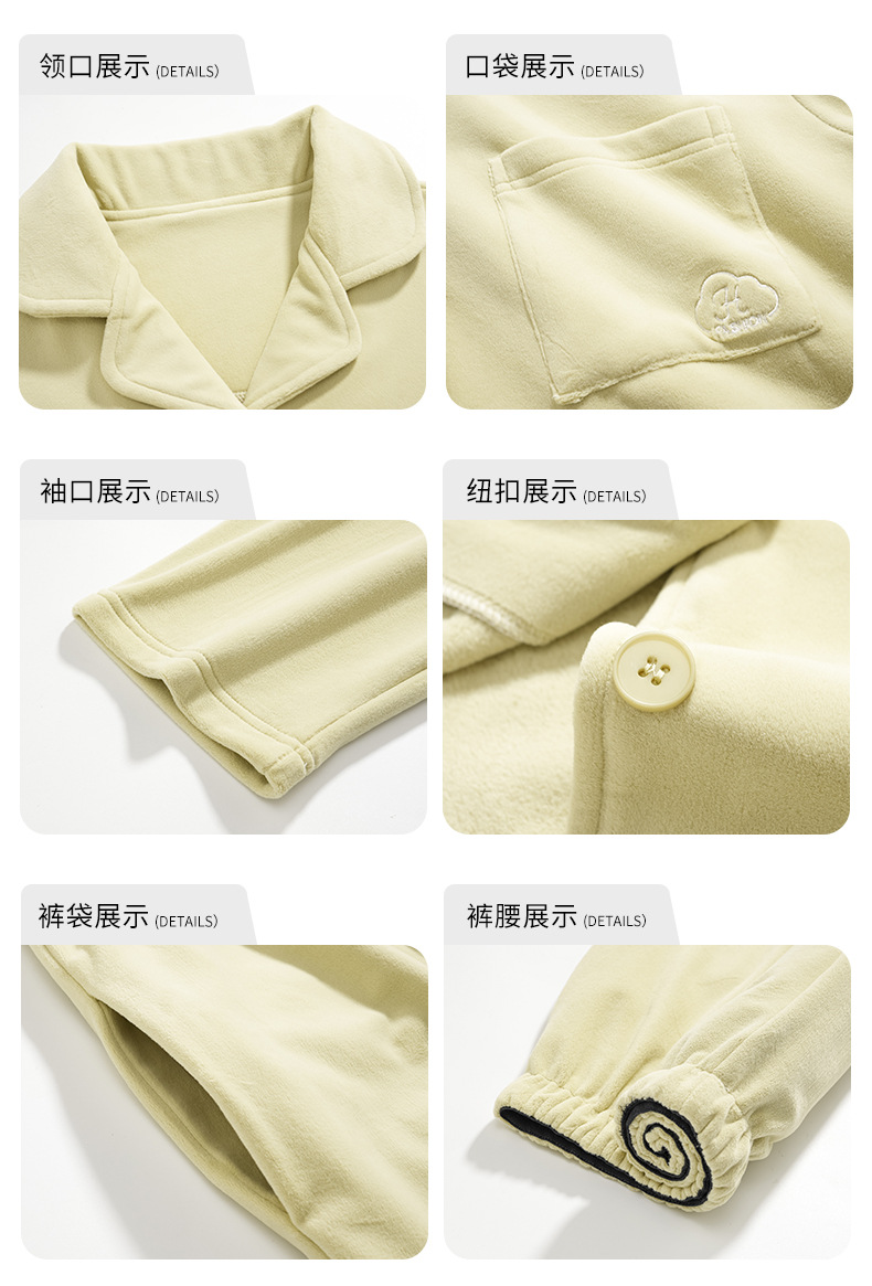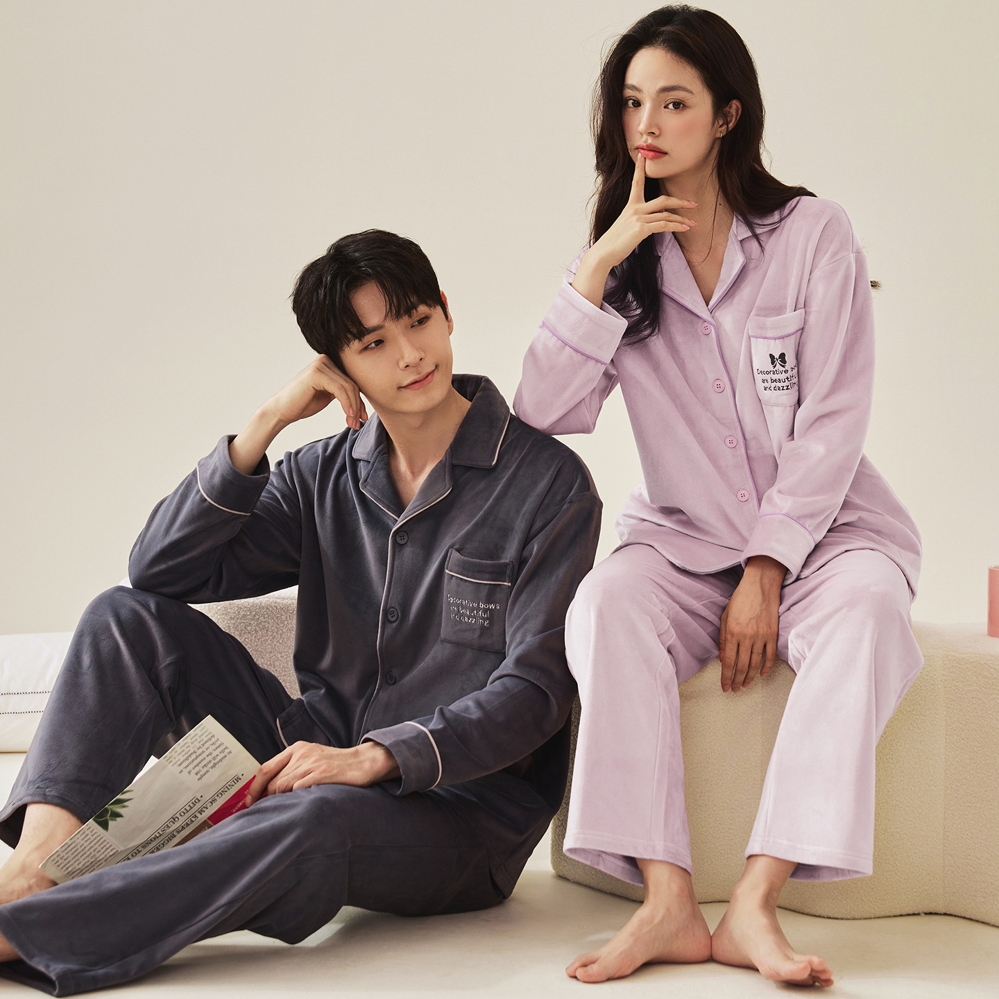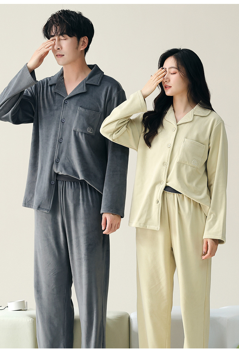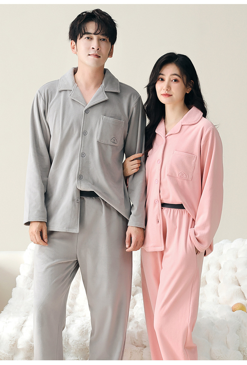 海岛绒情侣睡衣加厚加绒套装翻领纯色大码秋冬男士女士长袖家居服