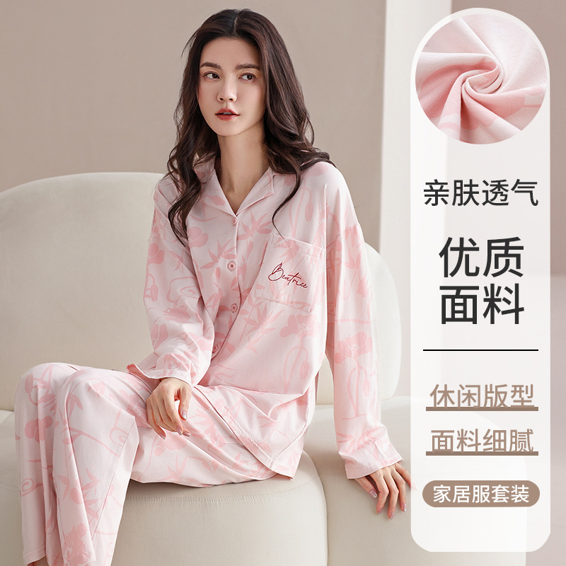 睡衣女100纯棉长袖春秋新款纯色女士简约休闲开衫全棉家居服套装