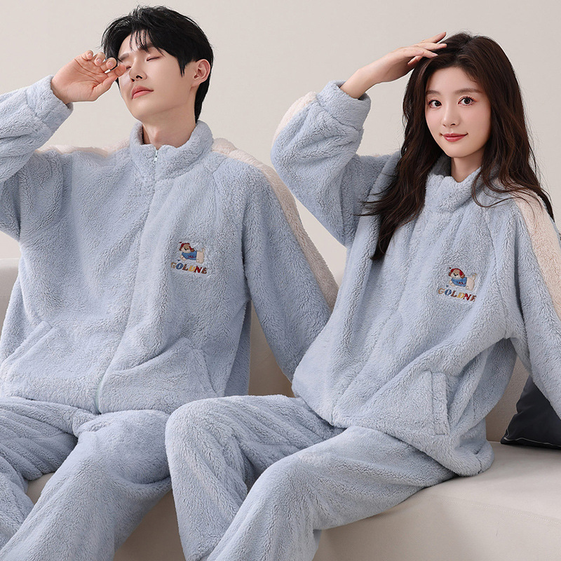 情侣睡衣秋冬珊瑚绒加绒加厚保暖立领拉链轻运动大码可外穿家居服