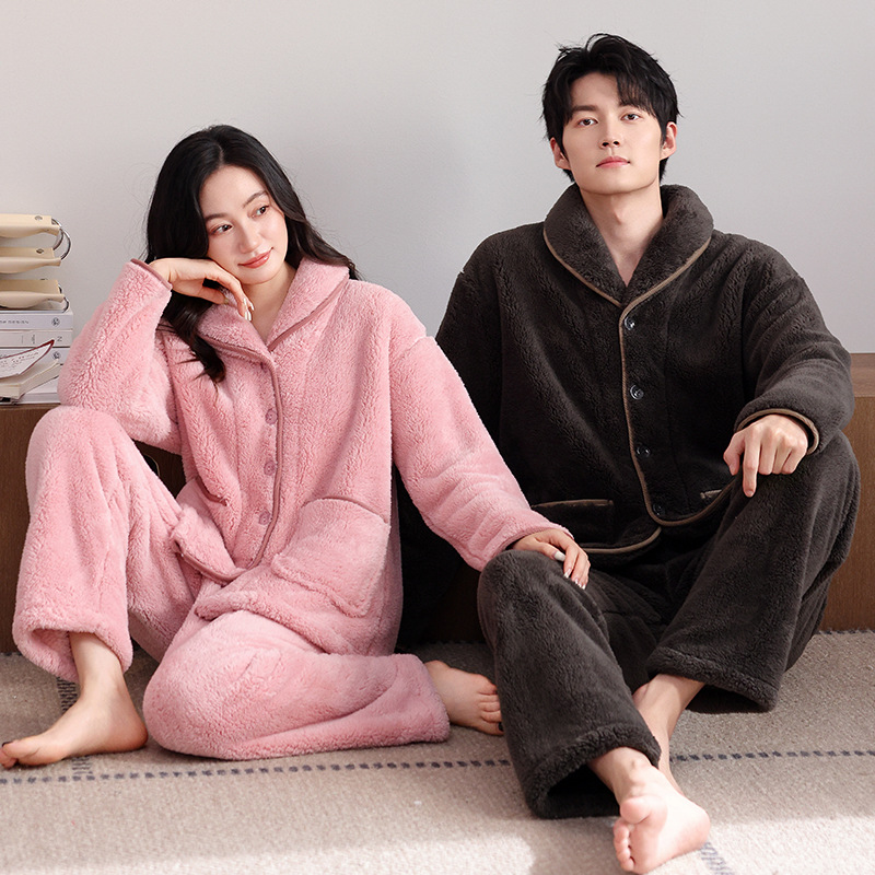 カップルパジャマ秋冬コーラル一男一女ベルベット厚手フランネル冬カーディガンホームウェアセット