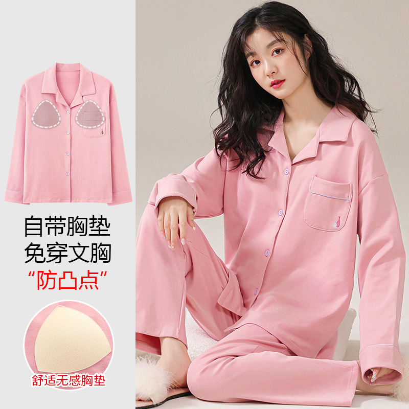 胸パッド付きのパジャマ女性カーディガン純綿長袖セットの大きいサイズは、シンプルな襟付きホームウェアを着ることができます