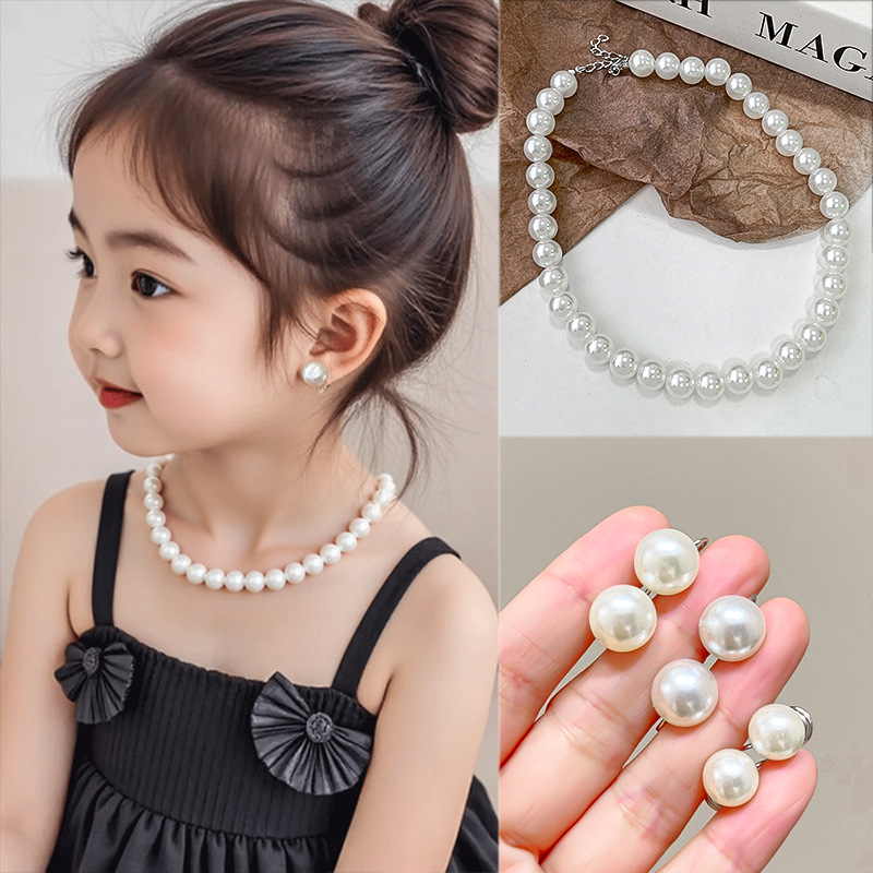 子供用パールネックレスイヤークリップ、女の子の気質、白い絶妙なアクセサリー、子供の日のパフォーマンスネックレス、鎖骨チェーンイヤリング